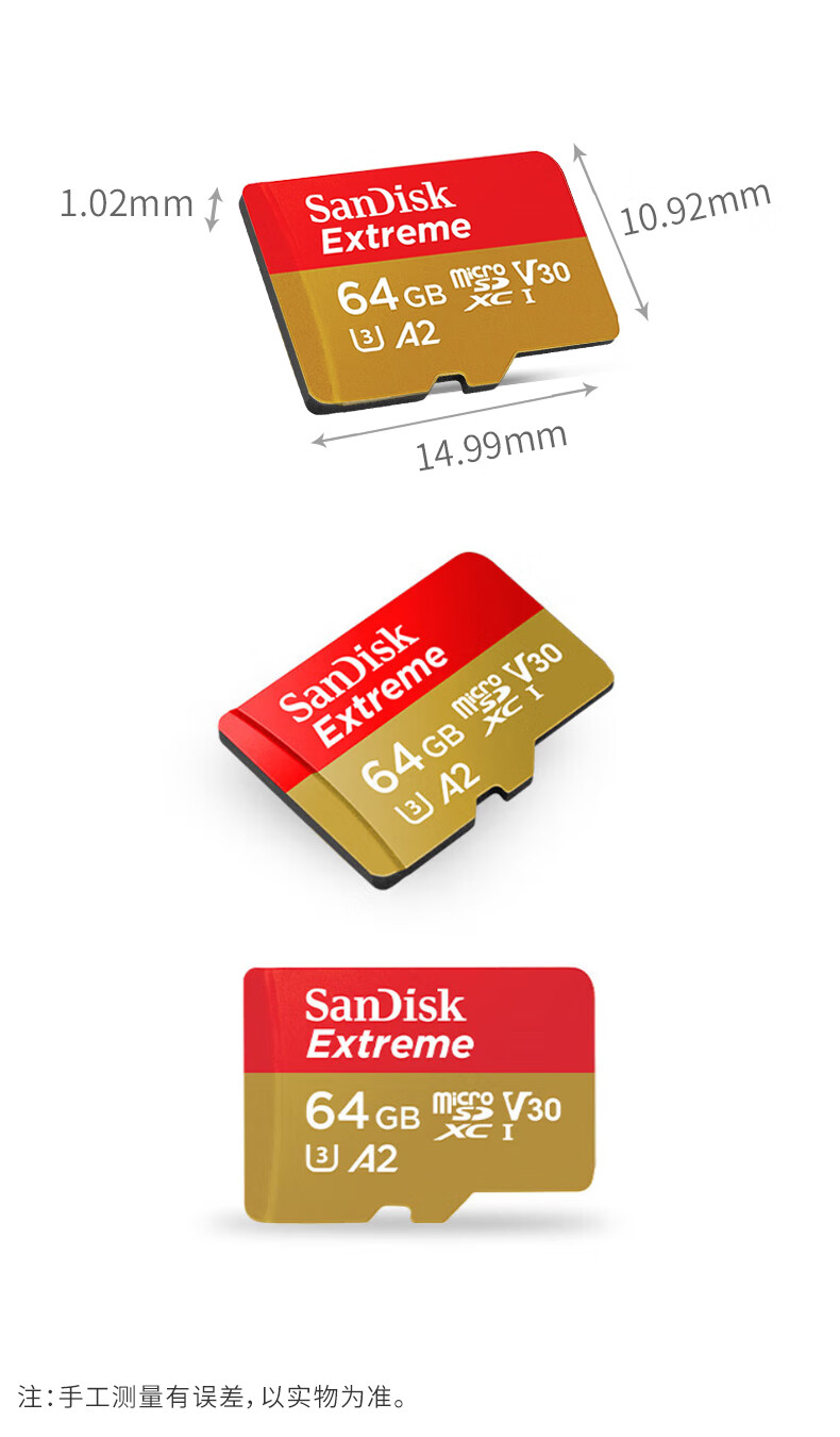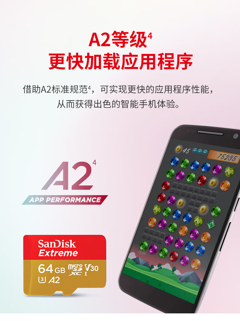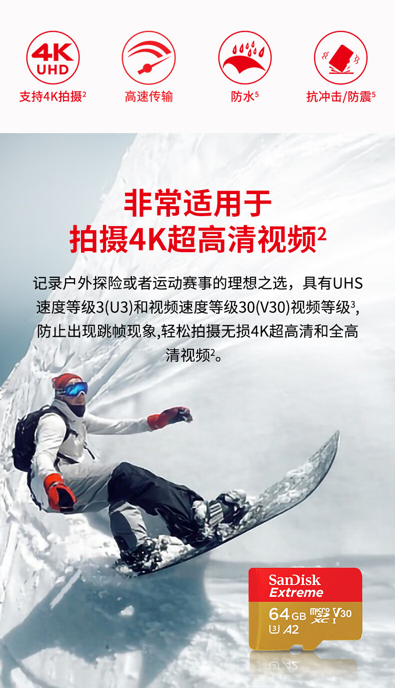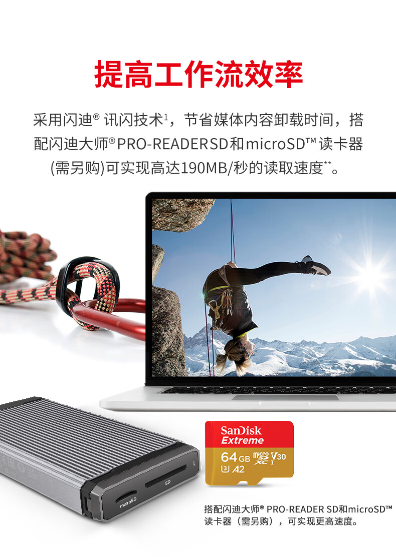 闪迪(SanDisk)64GB TF(MicroSD)内存卡 4K极速金卡A2 V30 U3行车记录仪 运动相机无人机 监控存储卡 读170MB/s