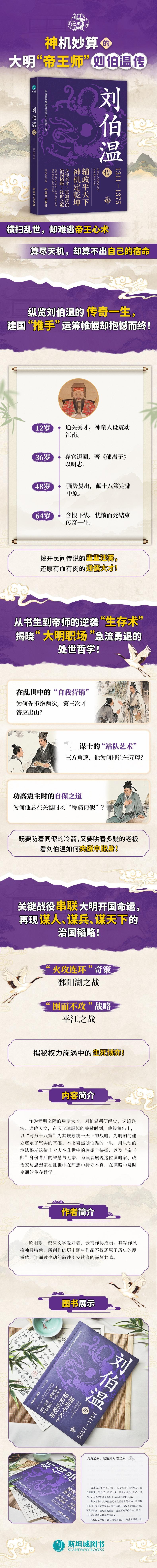 第一章 龙潜溪边,俊才初露锋芒文武兼备,传奇家风代代传 // 003一考成名,少年才子露头角 // 008拜师郑复初,英才更进一层天 // 011第二章 游学四方,从小书生成长为智囊游少微山,奇遇不断长见识 // 017考中进士,初入仕途却遭压制 // 022隐居山林,悟道修身待时机 // 027平定盗贼,遭谴责愤怒辞官 // 032第三章 乱世风云,初露锋芒展智谋乱世英雄起四方,刘伯温静待明主 // 041君臣初相识,慧眼识真龙定大局 // 049出山辅佐,献上《时务十八策》// 055第四章 鄱阳湖大战,一计定乾坤龙湾之战,献策应对陈友谅 // 061洪都之战,朱军以弱胜强 // 067鄱阳湖大战,朱元璋终取胜利 // 073平江之战,协助朱元璋灭张士诚 // 078第五章 运筹帷幄,描绘大明蓝图灭元建明,平江战后定山河 // 087劝君买善,安邦定国记 // 094《烧饼歌》奇谈,神秘预言引轰动 // 102第六章 秉公论相,治国安邦显英明立军卫法,肃朝纲之威 // 111不徇私情,秉公论相显贤名 // 116兴水利之业,谋苍生福祉 // 122第七章 晚年遭遇,权谋倾轧的宿命功高盖主,贤臣遭猜忌 // 131含恨而终,宦海沉浮病骨衰 // 136后主追赐,刘伯温身后荣光 // 140第八章 明星陨落,后世传颂刘伯温家族兴衰,风云变幻中的风骨气节 // 147文学成就,智慧与才情的结晶 // 154后世评价,史笔下的多面华章 // 162附录一:家族世系 // 165附录二:明初重要历史人物介绍 // 169附录三:刘伯温重要事件与时间线 // 173