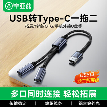 毕亚兹 USB一分二Type-C双母口分线器 多口OTG转接器扩展器充电传输数据 适用电脑平板U盘鼠标键盘转接头