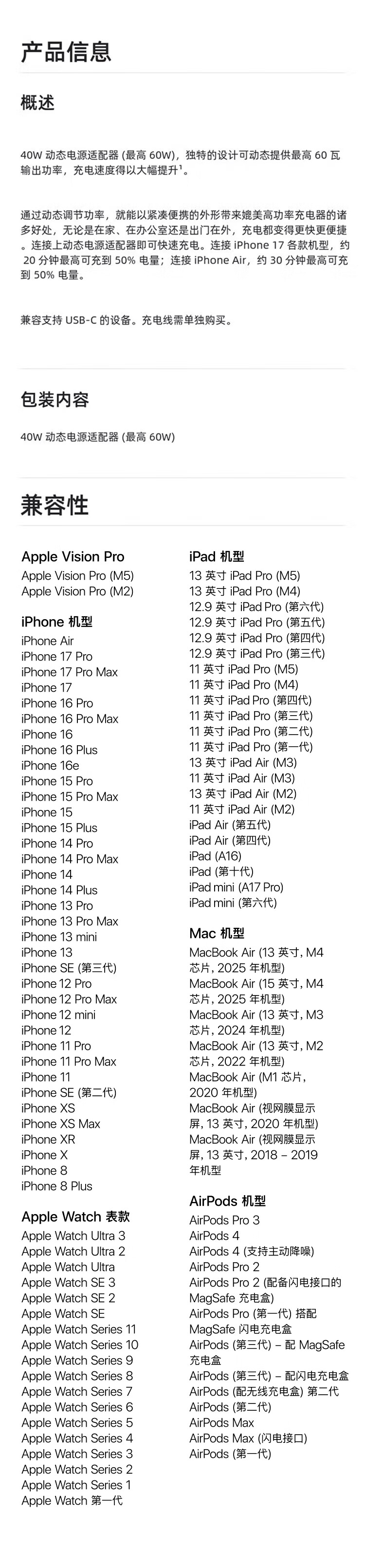 Apple/苹果 40W USB-C充电器动态调节功率 type-c充电器苹果手机充电 苹果17手机充电器