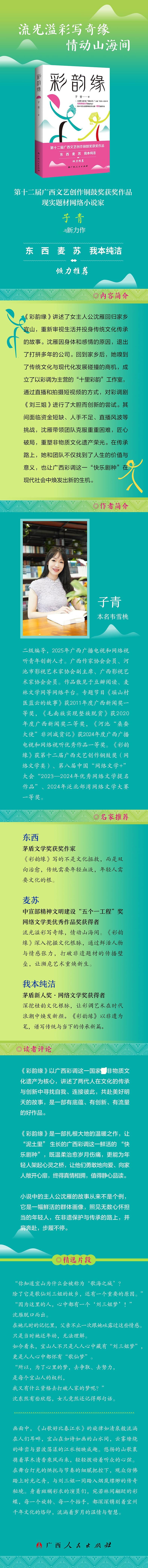 本书讲述了女主人公沈雁回归家乡宜山,重新审视生活并投身传统文化传承的故事。沈雁因身体和感情的原因,退出了打拼多年的公司。回到家乡后,她嗅到了传统文化与现代化发展碰撞的商机,成立了以彩调为主营的“十里彩韵”工作室,通过直播和拍摄短视频的方式,对彩调剧《刘三姐》进行了大胆而创新的尝试。其间面临资金短缺、人手不足、直播风波等挑战,沈雁带领团队克服重重困难,匠心破局,重塑非物质文化遗产荣光。在传承路上,她和团队不仅找到了人生的价值与意义,也让广西彩调这一“快乐剧种”在现代社会中焕发出新的生机。