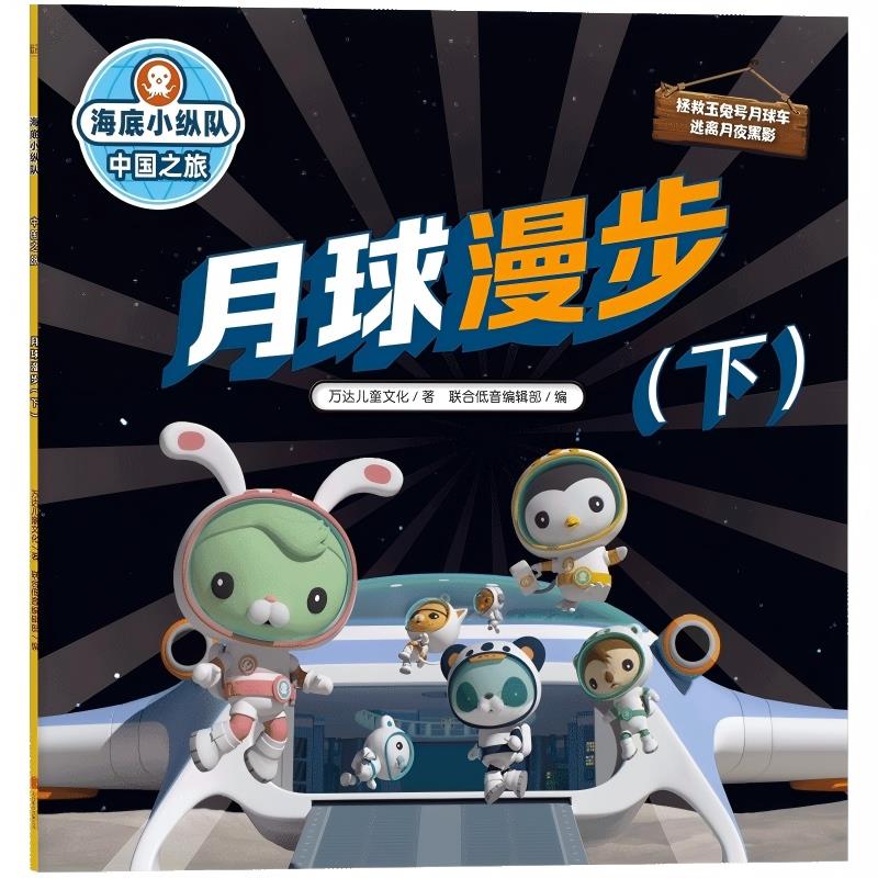 《海底小纵队·中国之旅:月球漫步(下)》紧接上册情节,讲述了小纵队在虚拟月球上的探索、救援与返航的精彩冒险。在巨大的陨石坑底,小纵队搬开陨石块,发现的并非“兔子怪兽”,而是中国探月工程中大名鼎鼎的 玉兔号月球车。玉兔号因陨石撞击受损,陷入休眠。在突突兔的巧手维修下,并通过太阳能充电,玉兔号成功被唤醒。它热情地向队员们介绍了自己的科学使命:利用相机、探月雷达和机械臂分析陨石、采集月壤,为人类研究月球提供宝贵数据。然而,在一次演示中,玉兔号的机械臂不慎损坏,急需备用齿轮。队员们沿着玉兔号在月面上留下的永久性车辙痕迹分头寻找。最终,皮医生意外发现了齿轮。修复完成后,新的危机接踵而至:月夜即将降临。月球表面温度将骤降至零下180摄氏度,队员们的航天服无法抵御这种严寒。在玉兔号的帮助下(用机械臂将队员们抛向飞船),小纵队与时间赛跑,惊险地赶在月夜黑影笼罩前返回了飞鱼艇。临别时,玉兔号毅然选择留守月球,继续履行探索使命。故事最后,队员们摘下虚拟体感头盔,从这场沉浸式的“月球漫步”中回到现实,心中充满了对真实太空探索的向往。竹风也向大家展望了中国2030年前实现载人登月的宏伟计划。