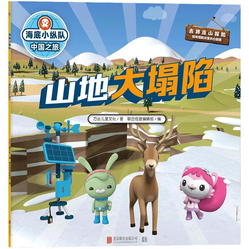 《海底小纵队·中国之旅:山地大塌陷》的故事背景设定在雄伟的祁连山脉,讲述了一场因气候变暖引发的(冻土融化导致的)地陷危机及其惊心动魄的救援行动。在祁连山区,阿依古丽、谢灵通和突突兔正在部署冻土传感器,以监测因全球变暖而可能融化的冻土层。他们偶遇了因脚伤掉队的珍稀动物:白唇鹿“多谷”。正当皮医生和巴克队长赶来为多谷治疗并准备帮助它寻找族群时,冻土传感器发出警报:气温上升导致冻土温度升高,地下冰层融化形成空洞,即将引发大规模地面塌陷。更危急的是,多谷的整个白唇鹿族群正在迁徙途中,很可能身处险境。队长果断将团队分为两组:突突兔和谢灵通驾驶太阳鸟艇,护送多谷前往阿依古丽根据数据找到的安全山地;队长则与阿依古丽驾驶蜻蜓直升机,紧急寻找并引导白唇鹿群撤离。在引导鹿群逃离塌陷区时,一只名叫“朵朵”的小鹿不幸坠入陷坑。阿依古丽勇敢跳下营救,却因土层松软双双受困。千钧一发之际,巴克队长驾驶蜻蜓直升机返回,用救援绳成功将她们拉出险境。最终,所有白唇鹿安全抵达安全地带。