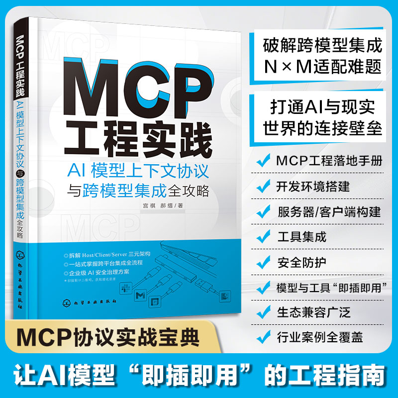 本书深入介绍模型上下文协议(MCP),它作为一种全新的标准,致力于打破模型之间的壁垒,实现高效的上下文连接。从 MCP 的诞生背景、架构组成,到与现有集成方案的对比优势,书中都进行了详细阐述。书中提供了全面且深入的指导。从搭建开发环境、安装官方SDK,到构建MCP服务器和客户端,每一步都有清晰的操作步骤与代码示例。适合AI开发者、架构师、技术爱好者等阅读。无论是想要深入了解MCP的技术原理,还是希望通过实战案例提升开发技能,或是探索AI在不同行业的创新应用,本书都能提供有价值的参考,帮助读者解锁AI上下文的无限可能,在AI开发领域取得新的突破。