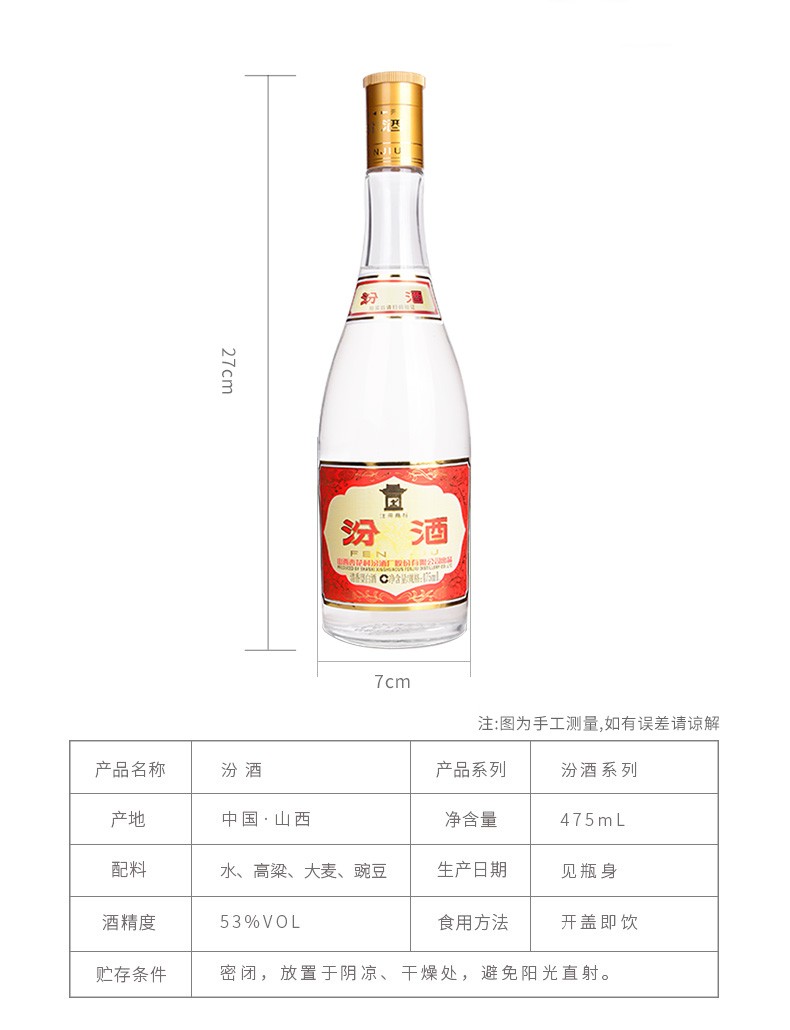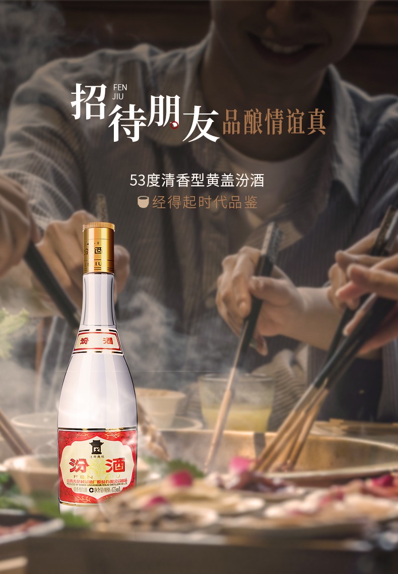 汾酒 黄盖玻汾 清香型白酒 53度 475ml 单瓶装 年份随机 不含礼袋
