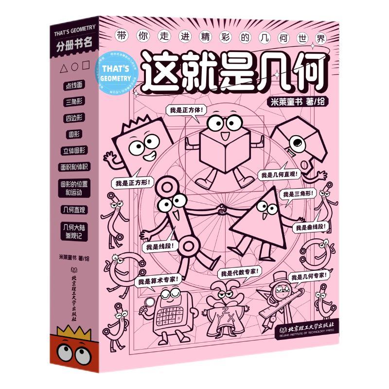本系列将几何图形拟人化,塑造出米莱宇宙中的几何星球,将几何的世界用漫画的方式呈现出来。参考人教版小学数学课本的教学顺序,从小初数学课标的要求出发,涉及小学学习中90%的知识点,包括点、线、角、四边形、三角形、圆形、立体图形、图形的运动和位置、面积、体积等,对几何知识进行系统的讲解。全套共9册,前7册为《点线面》《三角形》《四边形》《圆形》《立体图形》《面积和体积》《图形的运动和位置》,侧重于对几何知识的科普,并且在科普过程中,培养读者的感知能力,训练读者的空间观念;第8册为《几何直观》,让读者在经过系统的阅读之后,先感知各种几何图形及其组成元素,再以古代和现代对几何直观的重视和利用,建立形和数的联系,搭建起几何和代数的桥梁;第9册是《几何大陆参观记》,为故事番外,带领读者感悟算数思维、代数思维和几何思维。