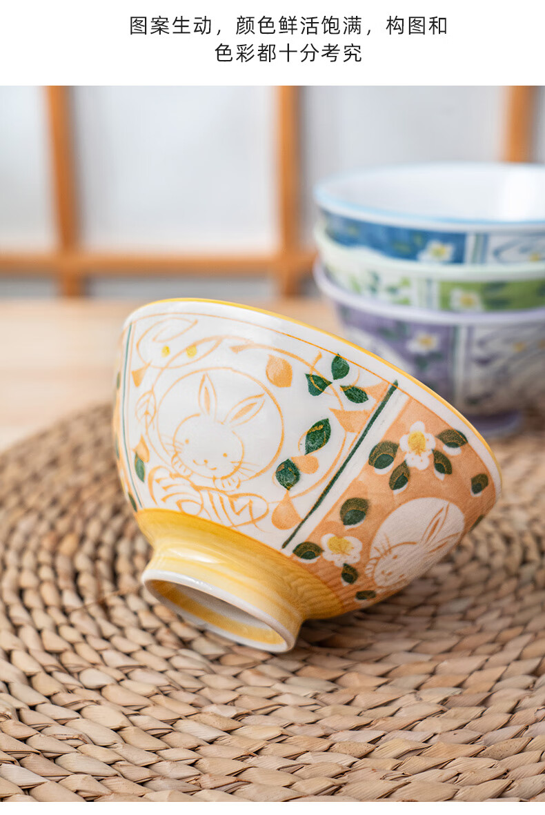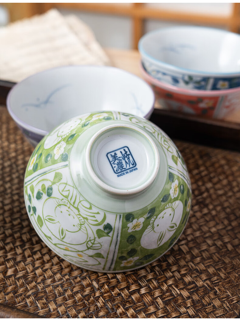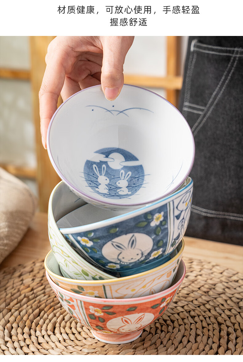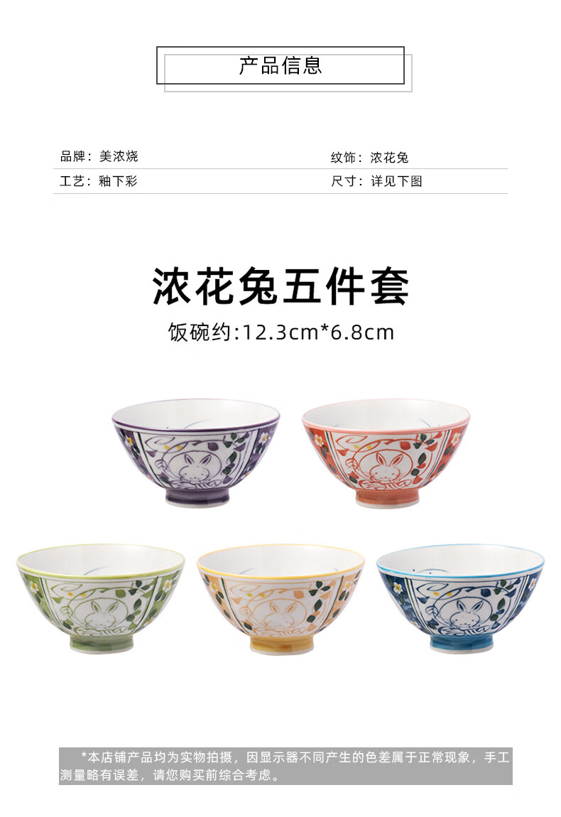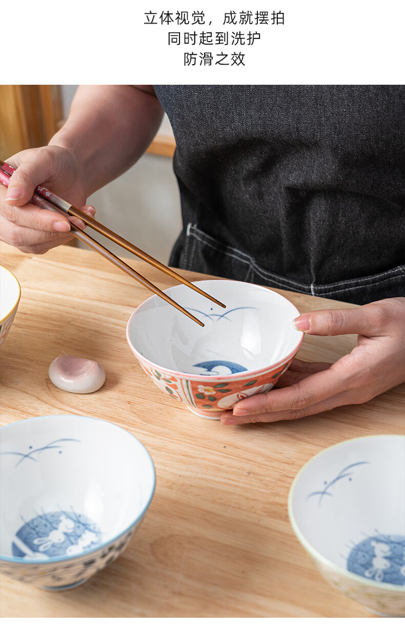 美浓烧日本进口陶瓷家用饭碗浓花兔5英寸釉下彩 5件套礼盒装
