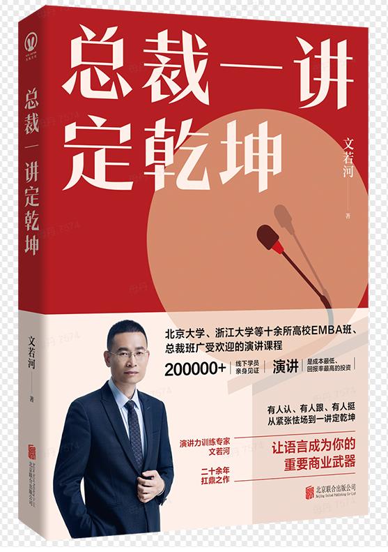 文若河 中国总裁演讲培训的定义者与开创者,著名演讲力训练专家,专注演讲力训练二十余年,北京大学、浙江大学等十余所高校EMBA班、总裁班特邀演讲力讲师,担任数百位企业家的私人演讲顾问。著有《会说话,得天下》《竞聘演讲轻松过关》《我最想要的口才指导:提升口才必读的“五个一百”》和“关键时刻,一句话就够了”系列作品等近十部畅销专著,主讲的“总裁一讲定乾坤”课程,被众多企业家誉为“上过的超值、管用的一门演讲课”。