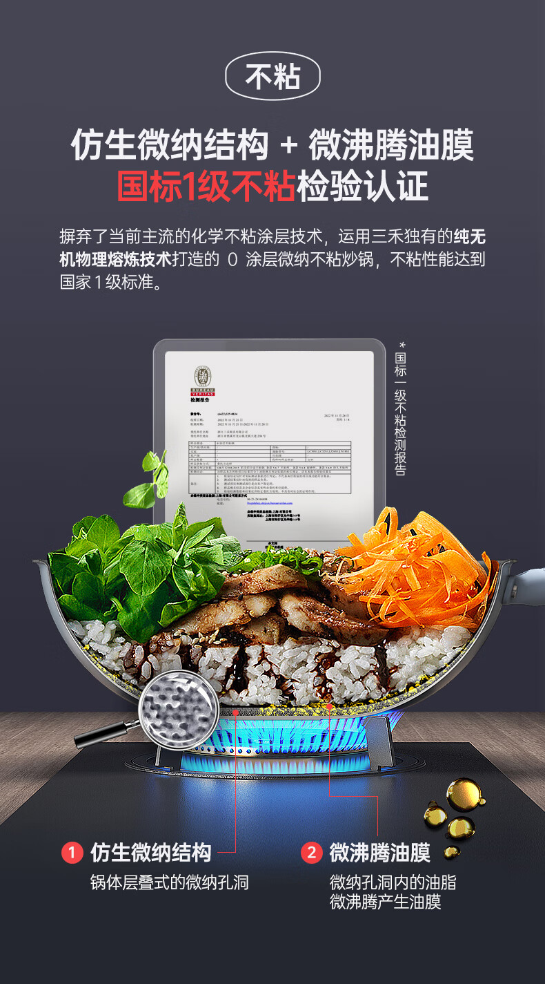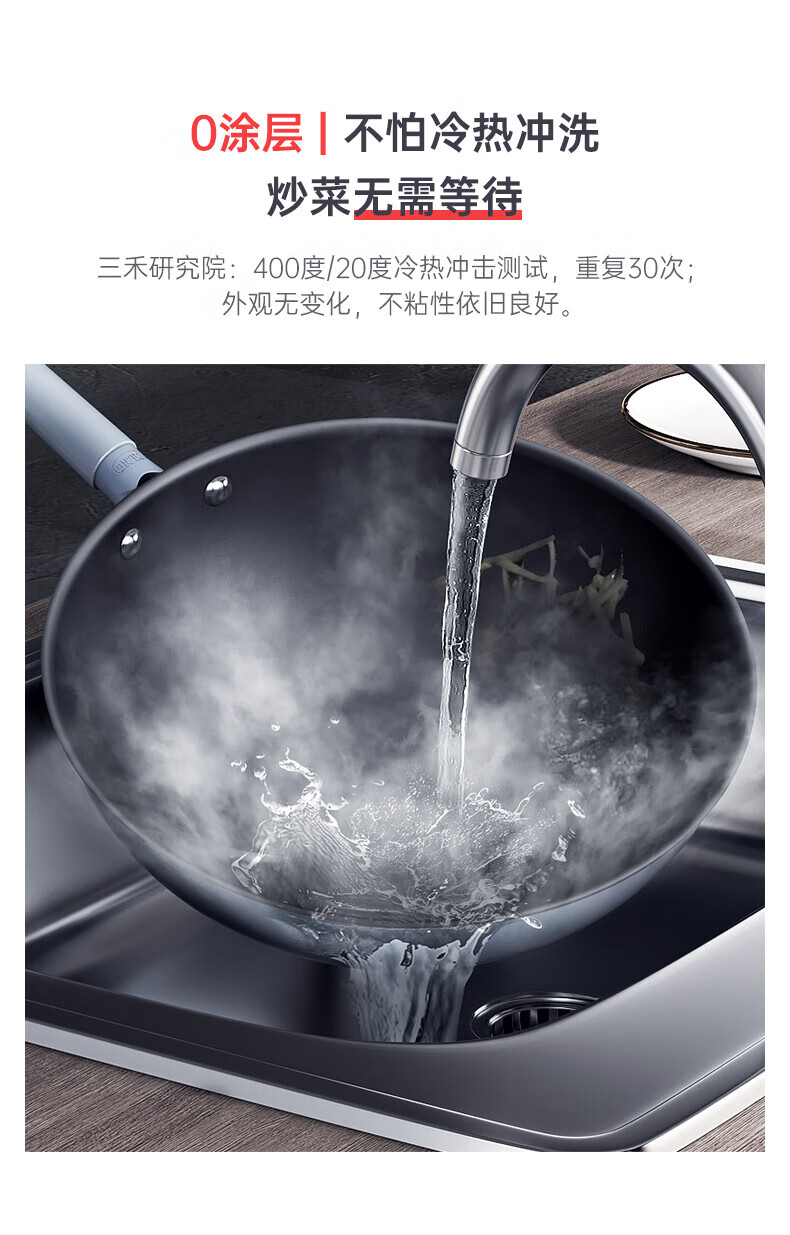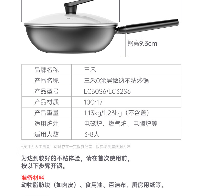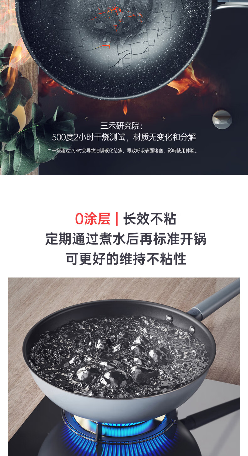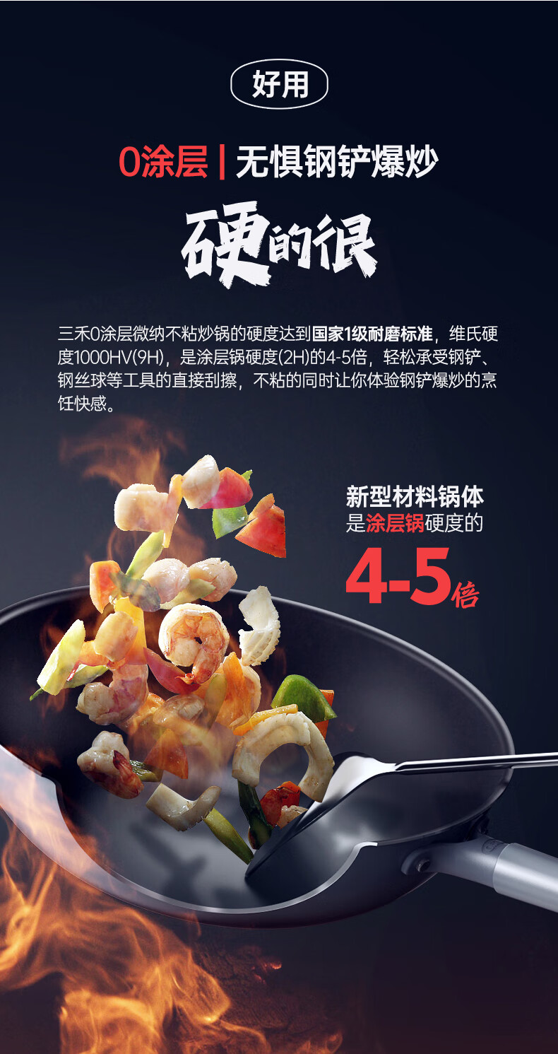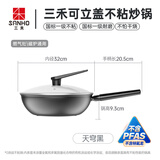 三禾微纳无涂层不粘炒锅可立盖炒菜锅无油烟含钛锅具32cm天穹黑配钢铲