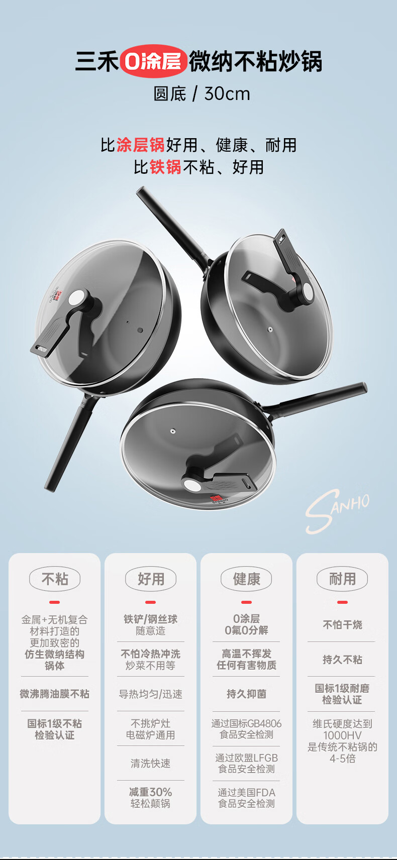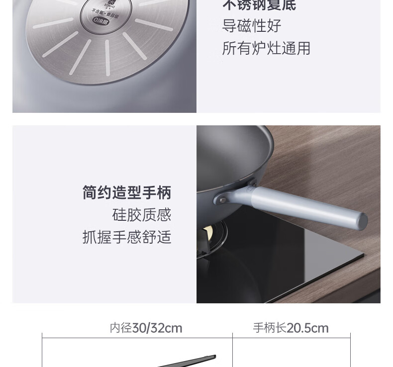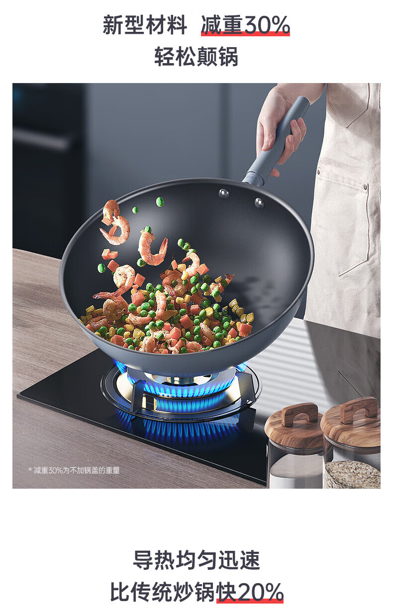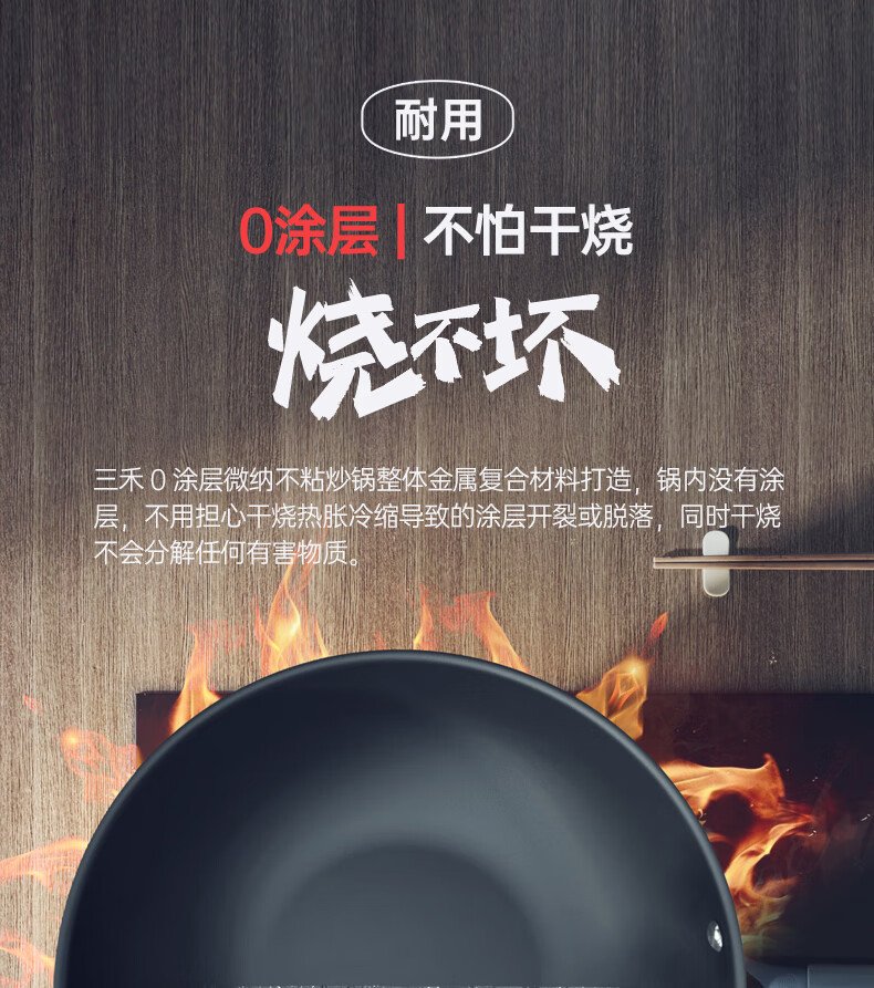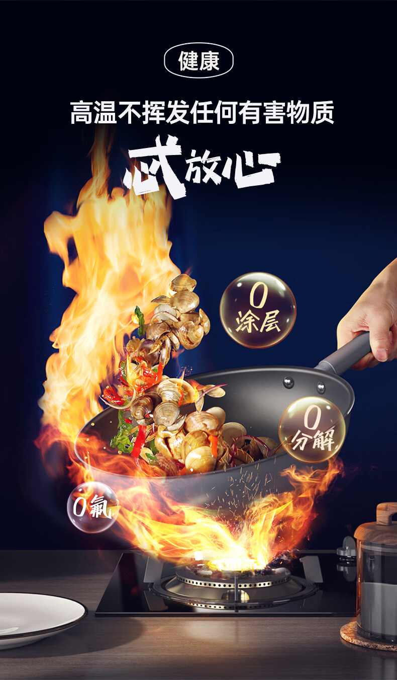 三禾微纳无涂层不粘炒锅可立盖炒菜锅无油烟含钛锅具32cm天穹黑配钢铲