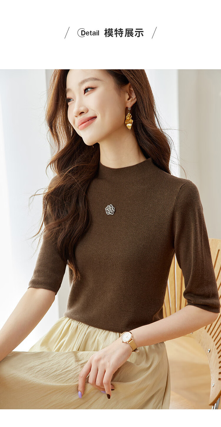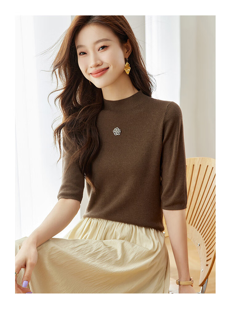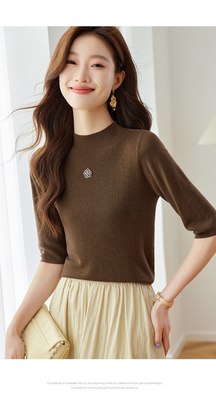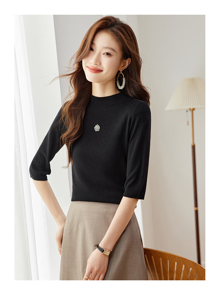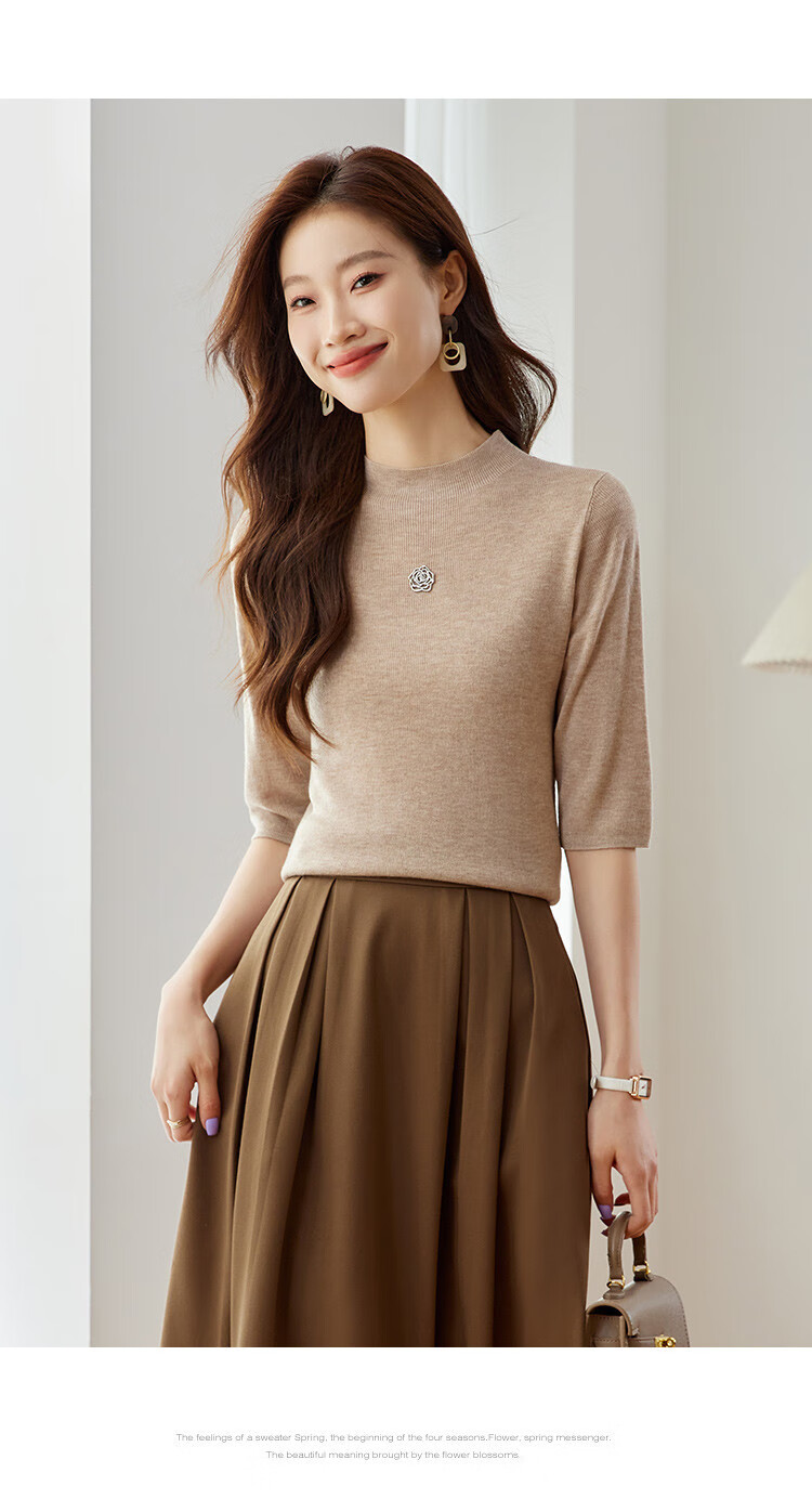 奢汐(Srcr)含羊绒羊毛短款山茶花打底衫女上衣早秋薄款简约百搭中袖针织t恤