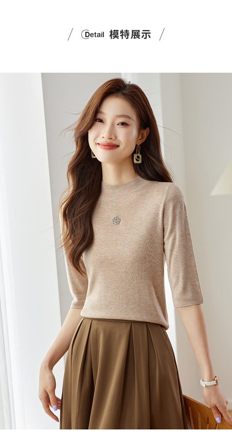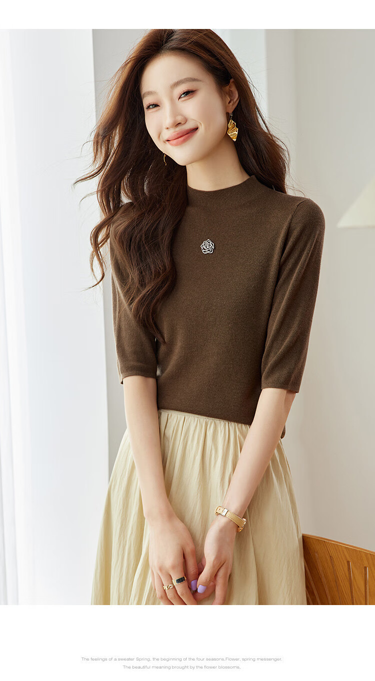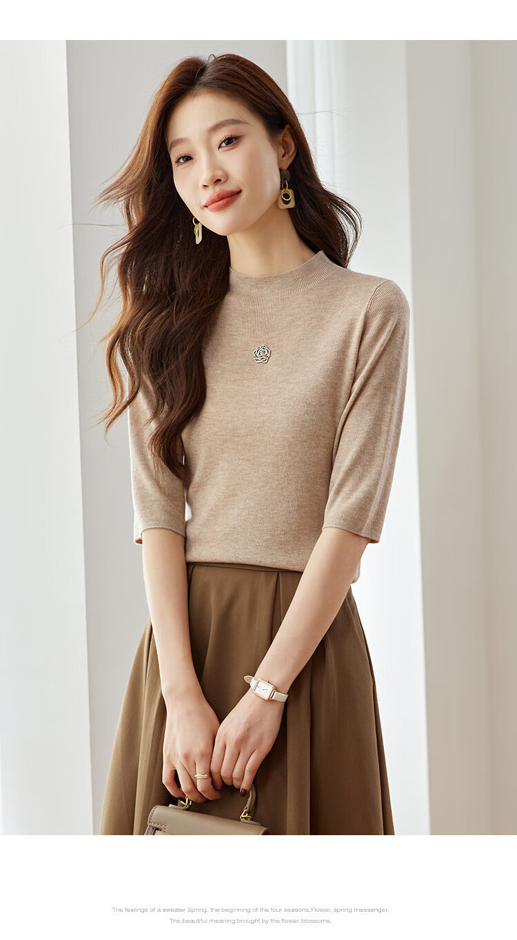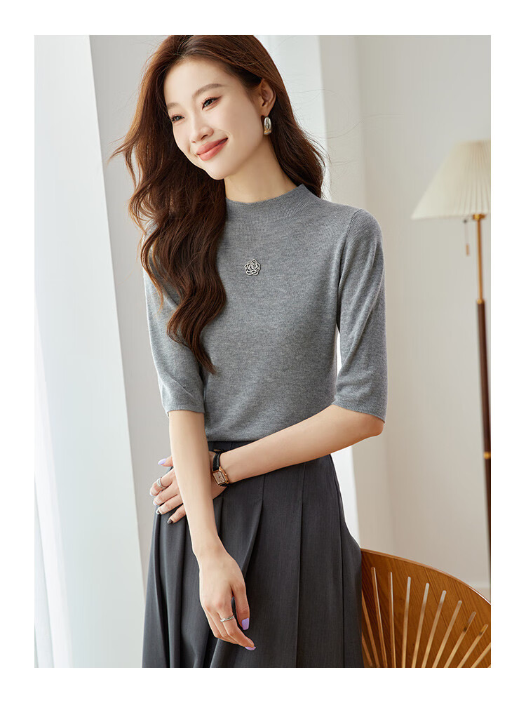 奢汐(Srcr)含羊绒羊毛短款山茶花打底衫女上衣早秋薄款简约百搭中袖针织t恤