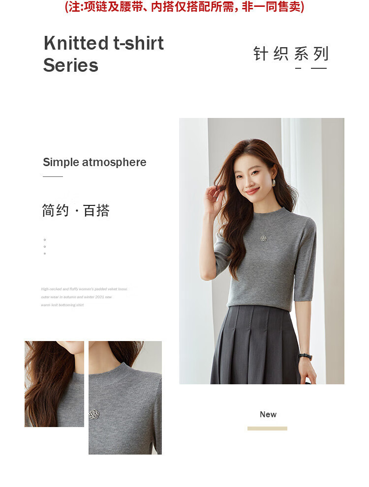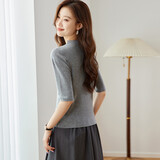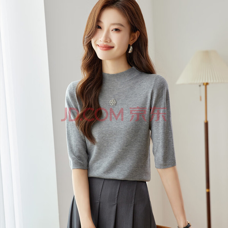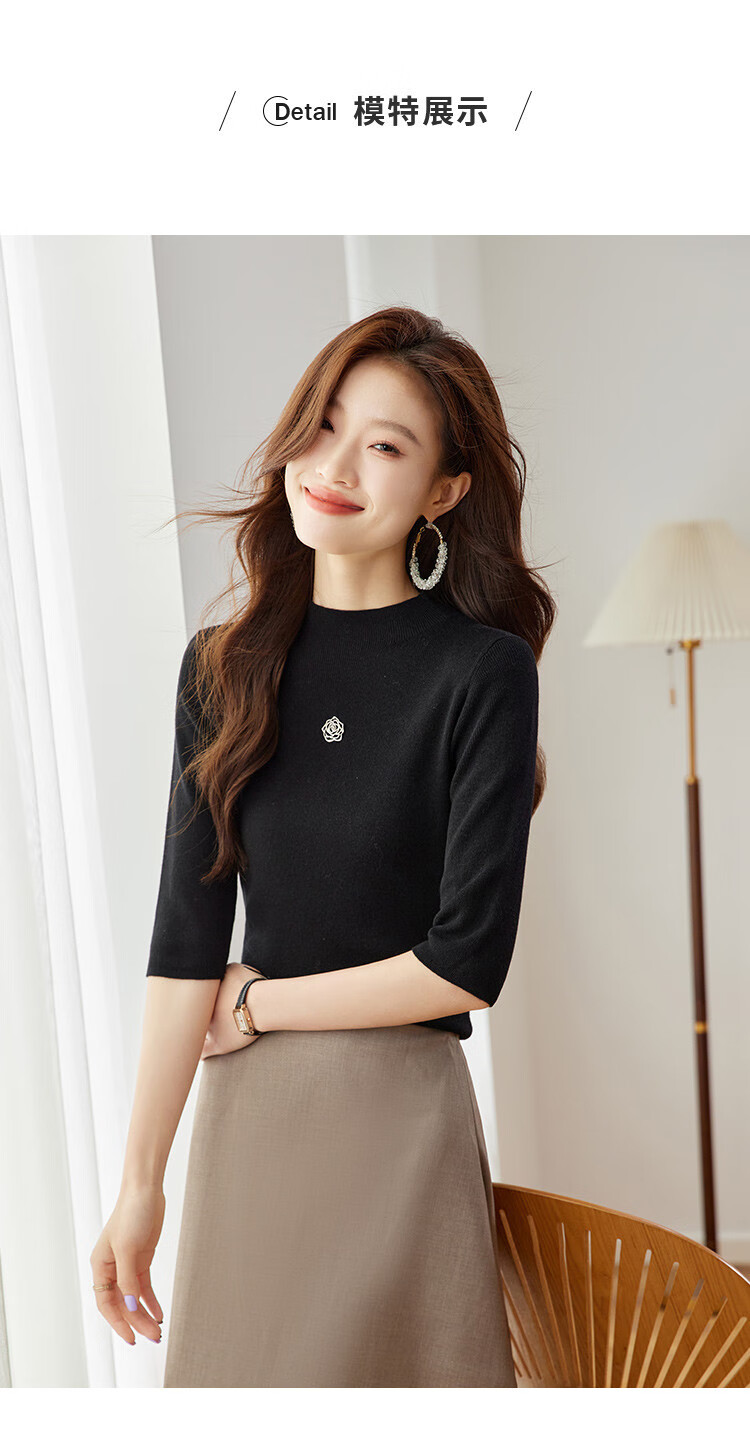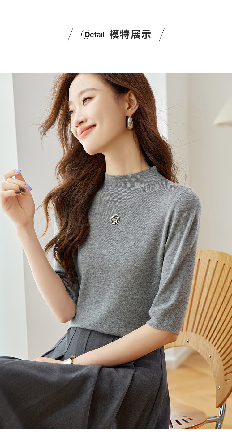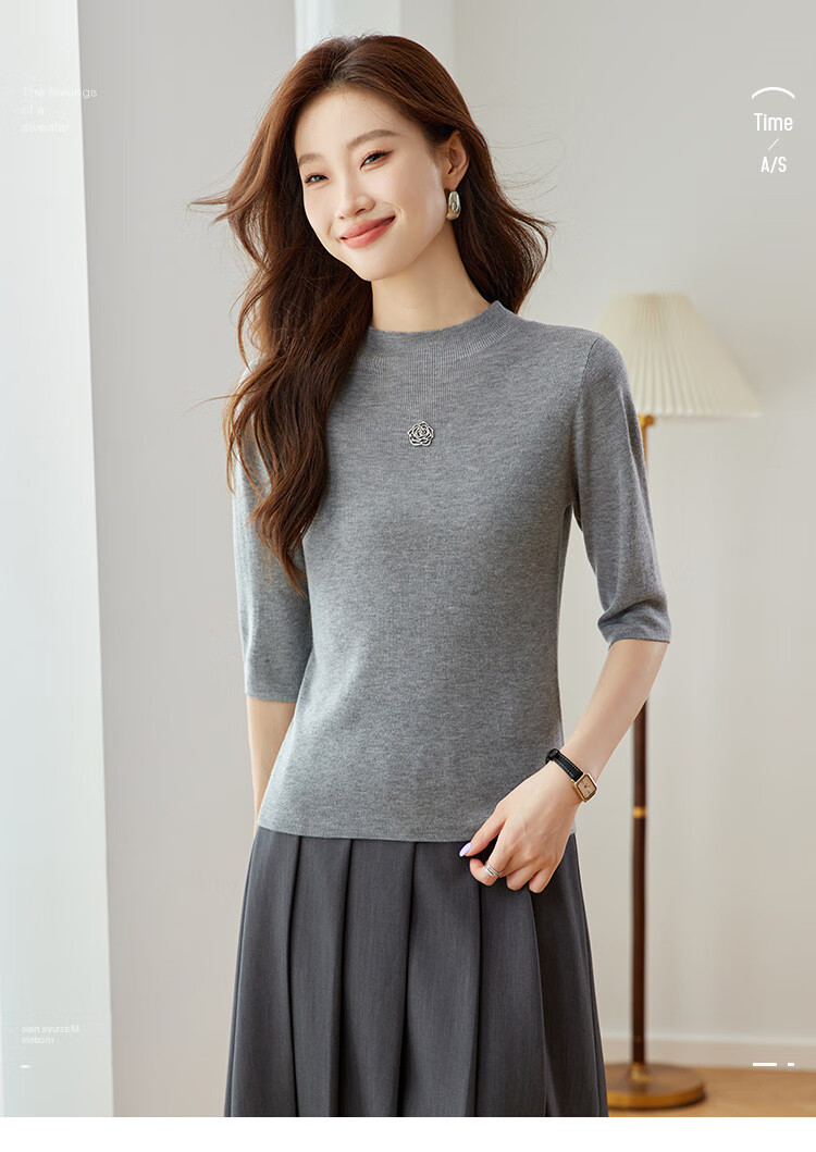 奢汐(Srcr)含羊绒羊毛短款山茶花打底衫女上衣早秋薄款简约百搭中袖针织t恤