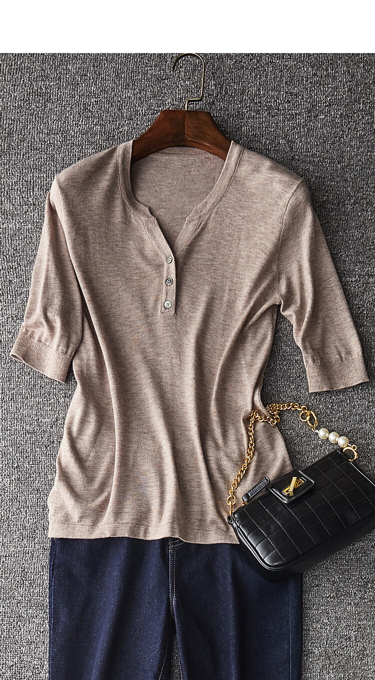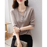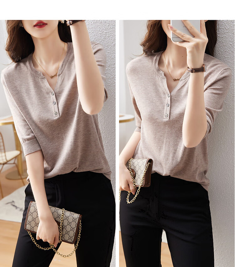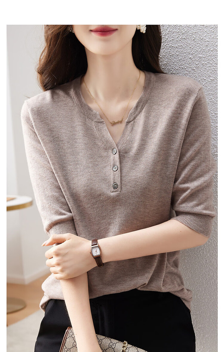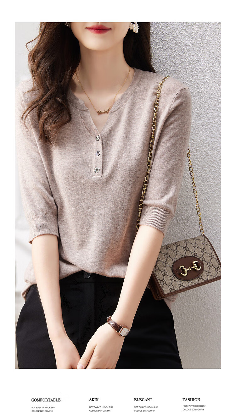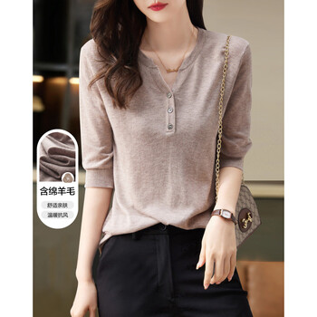德玛纳含绵羊毛五分袖线衫春秋半开领中袖单排扣针织衫女上衣
