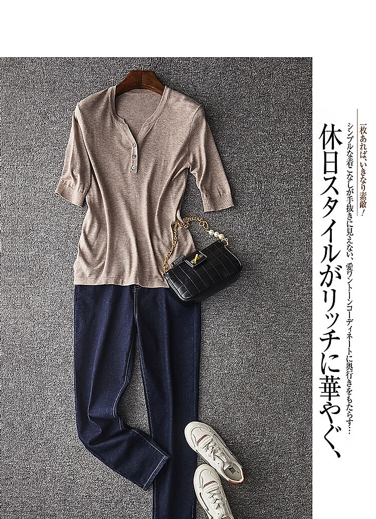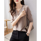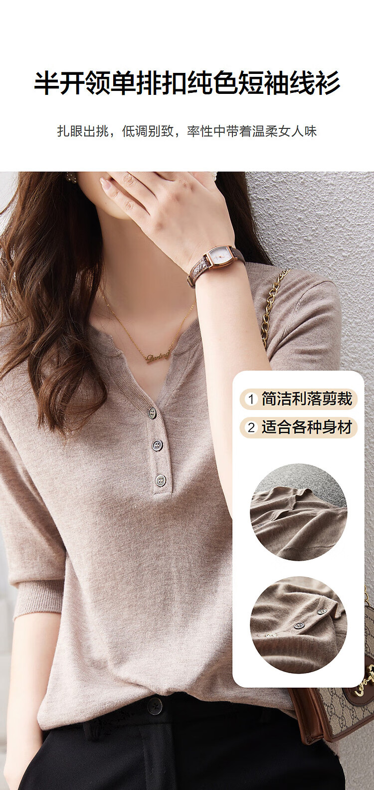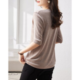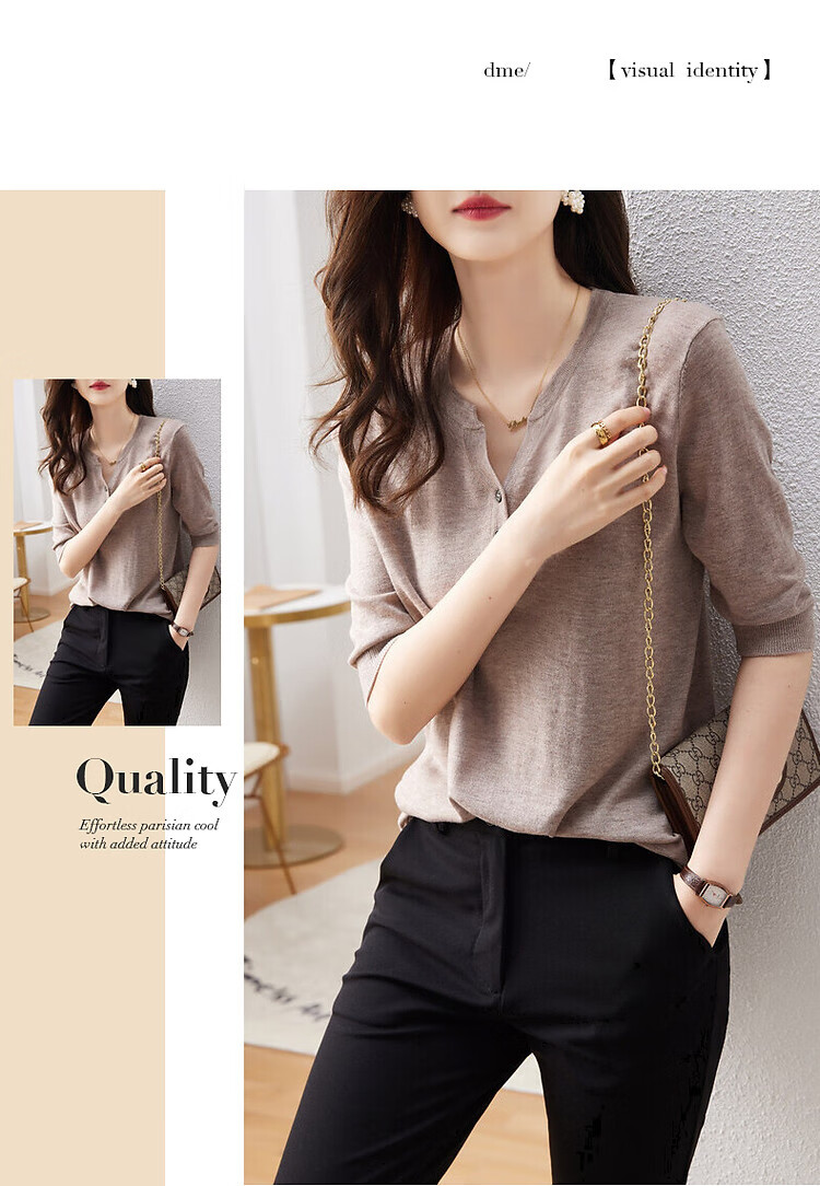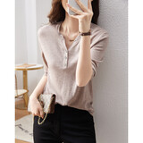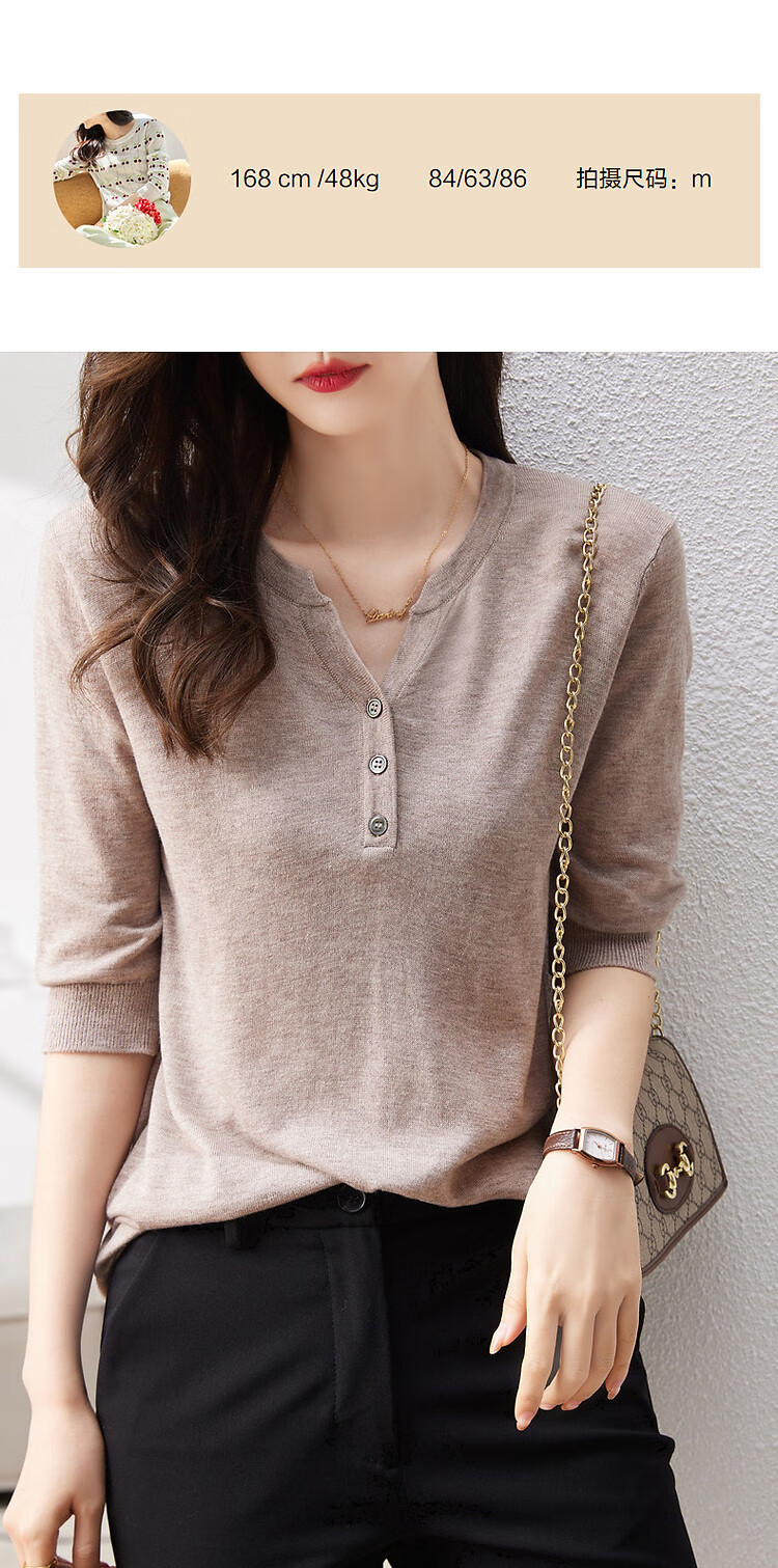 德玛纳含绵羊毛五分袖线衫春秋半开领中袖单排扣针织衫女上衣