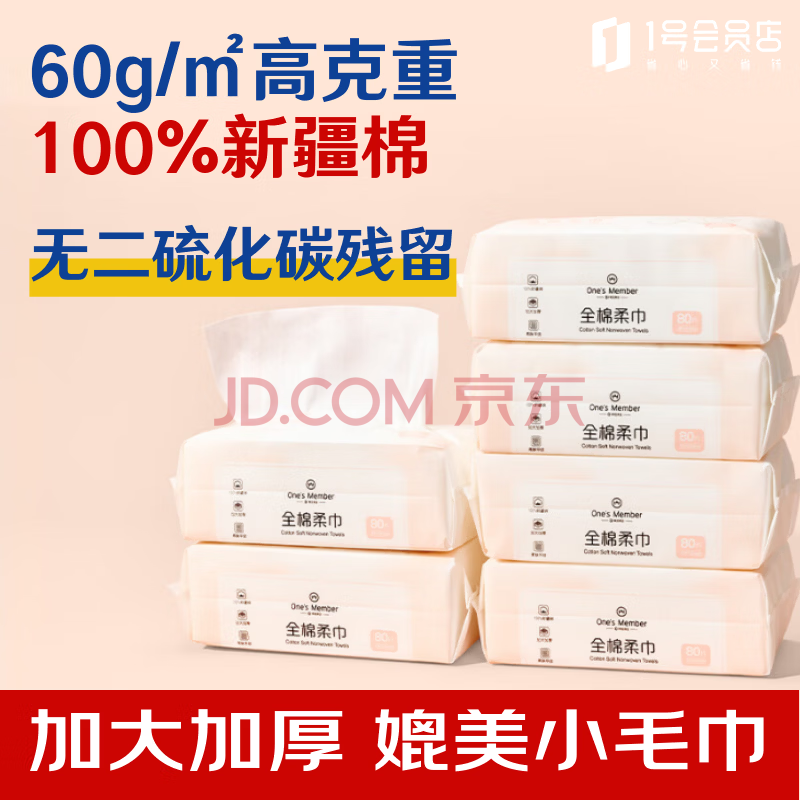 1号会员店(One's Member) 100%新疆棉全棉洗脸巾80抽*6包60g加厚棉柔巾加大