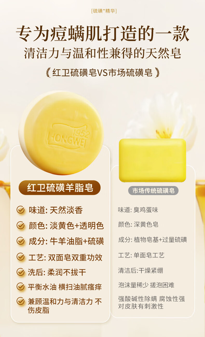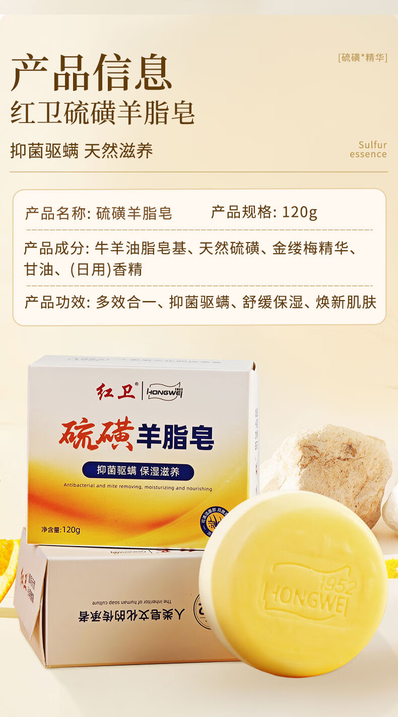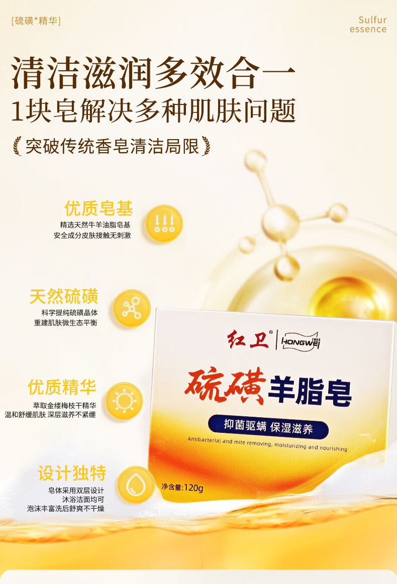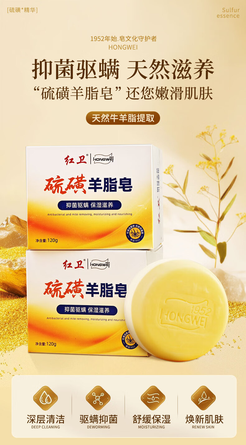 红卫硫磺羊脂皂120g香皂洗脸洗澡洗手三合一驱螨洁面肥皂抑菌控油