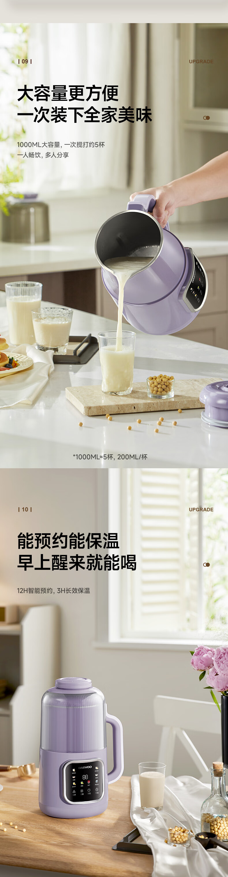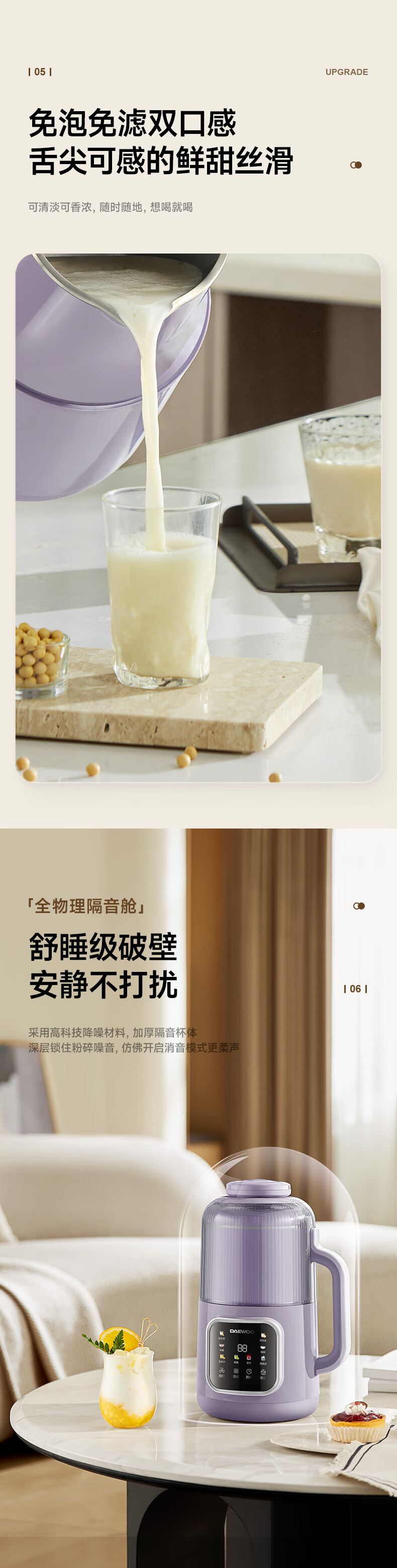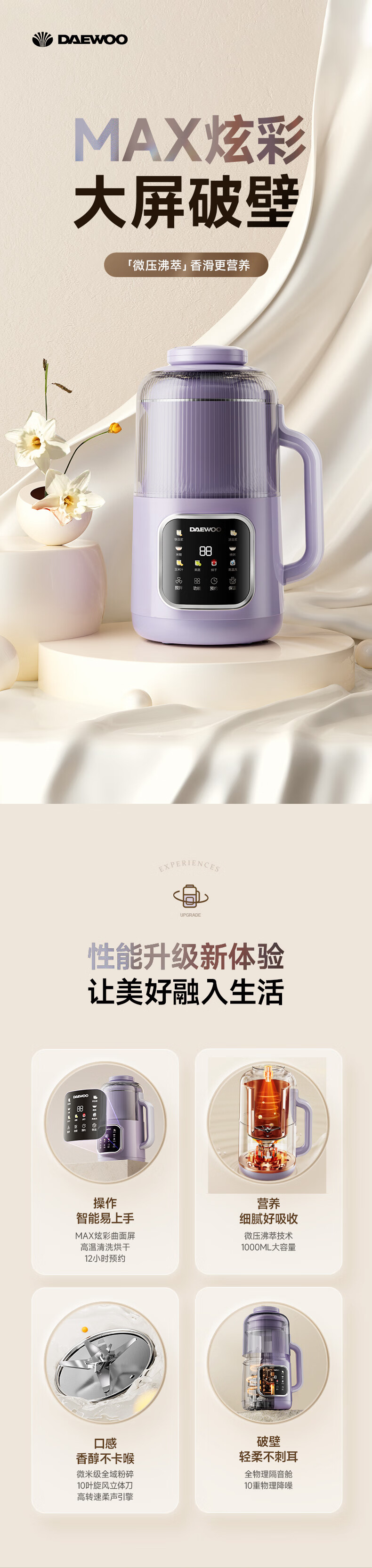 大宇(DAEWOO)破壁机家用豆浆机 1L微压2-3人食全自动轻音五谷杂粮免煮免手洗榨汁料理辅食机 紫色SM09