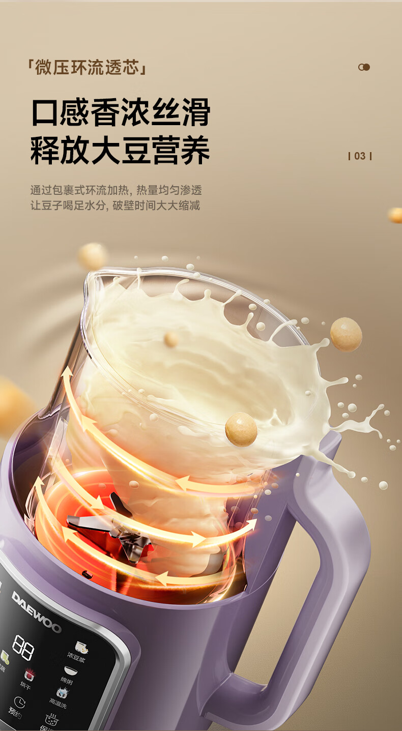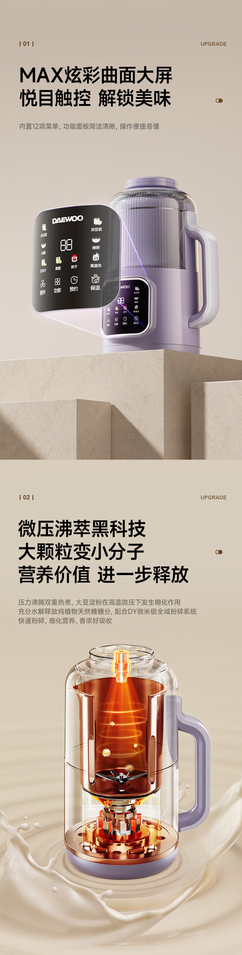 大宇(DAEWOO)破壁机家用豆浆机 1L微压2-3人食全自动轻
