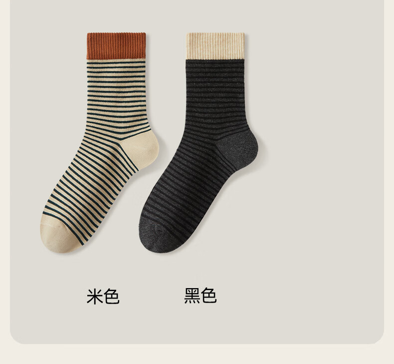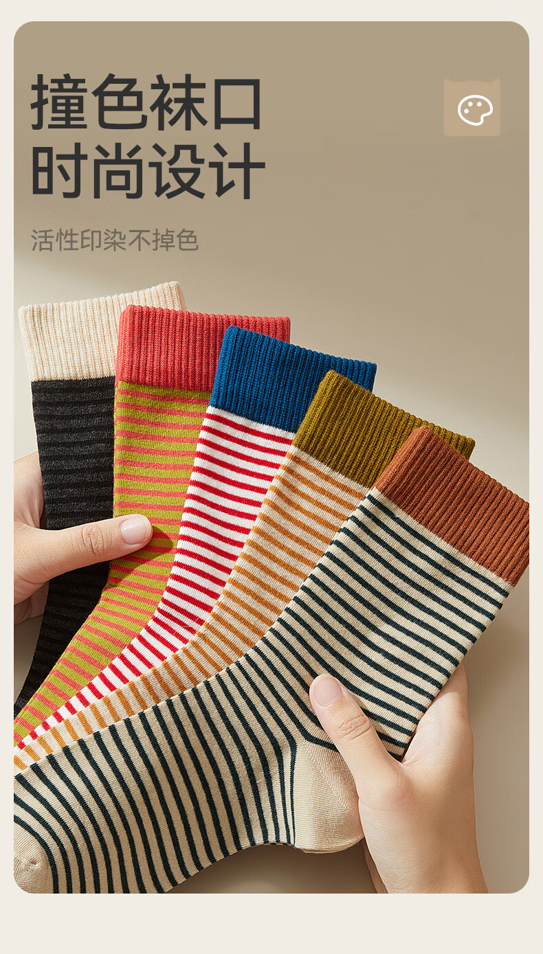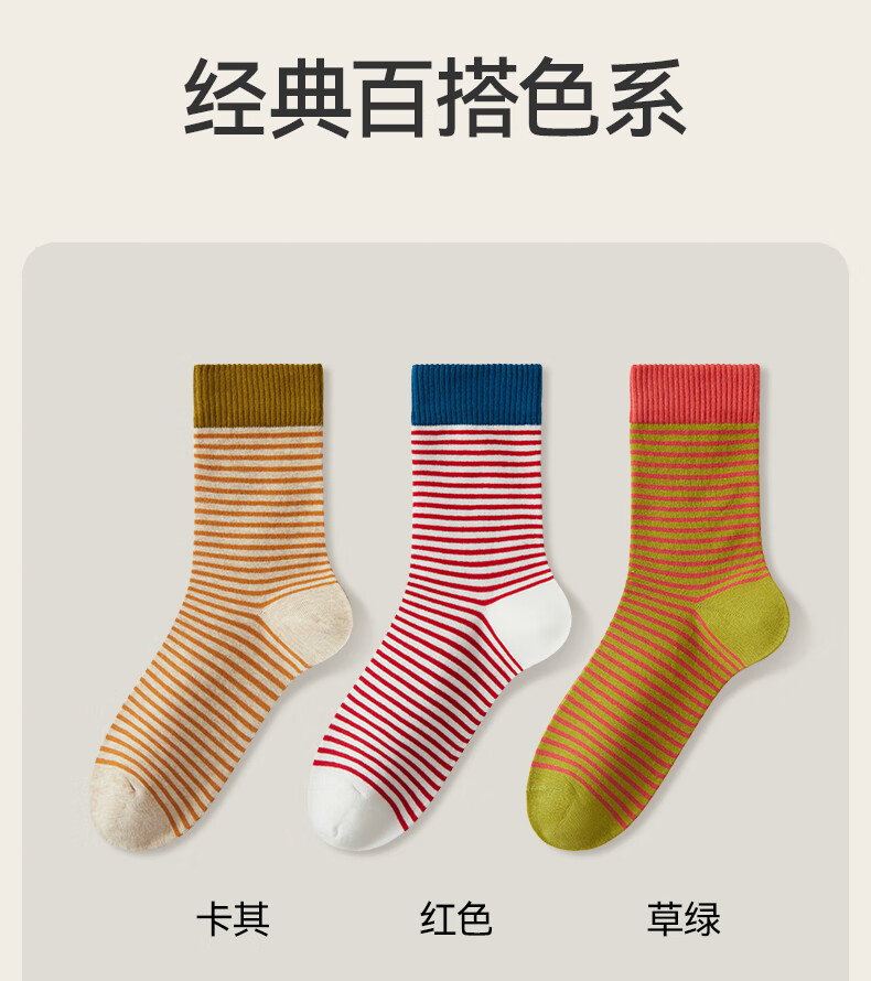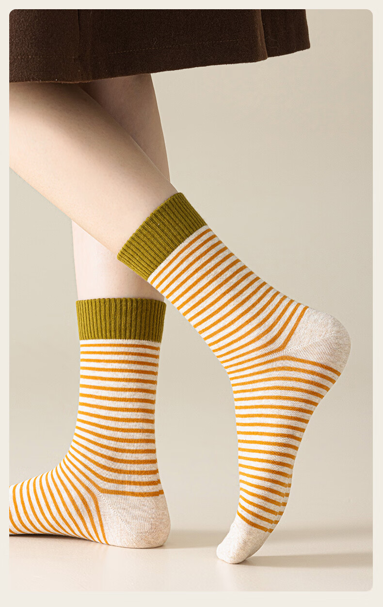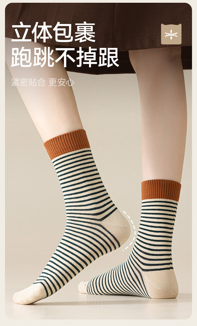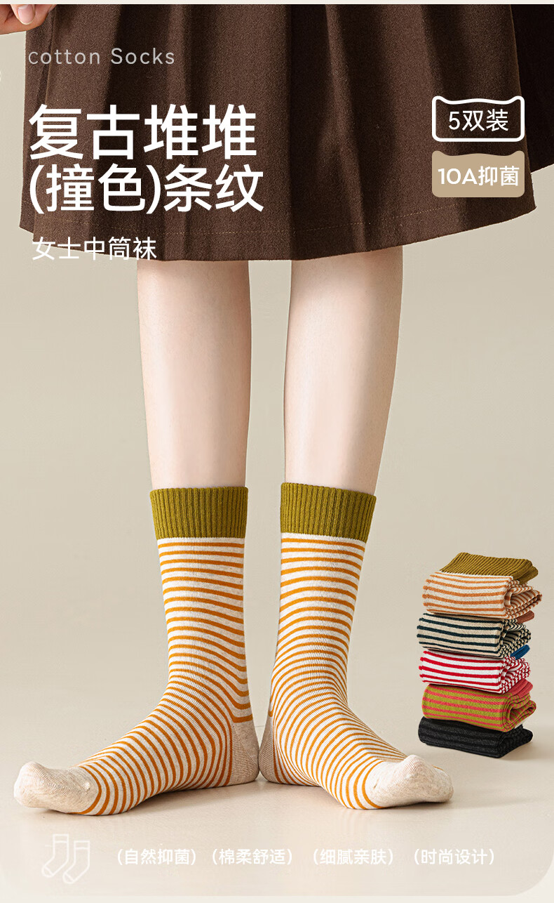 猫人女士袜子女【撞色条纹】春夏美拉德中筒袜防臭10A抑菌长袜女5双
