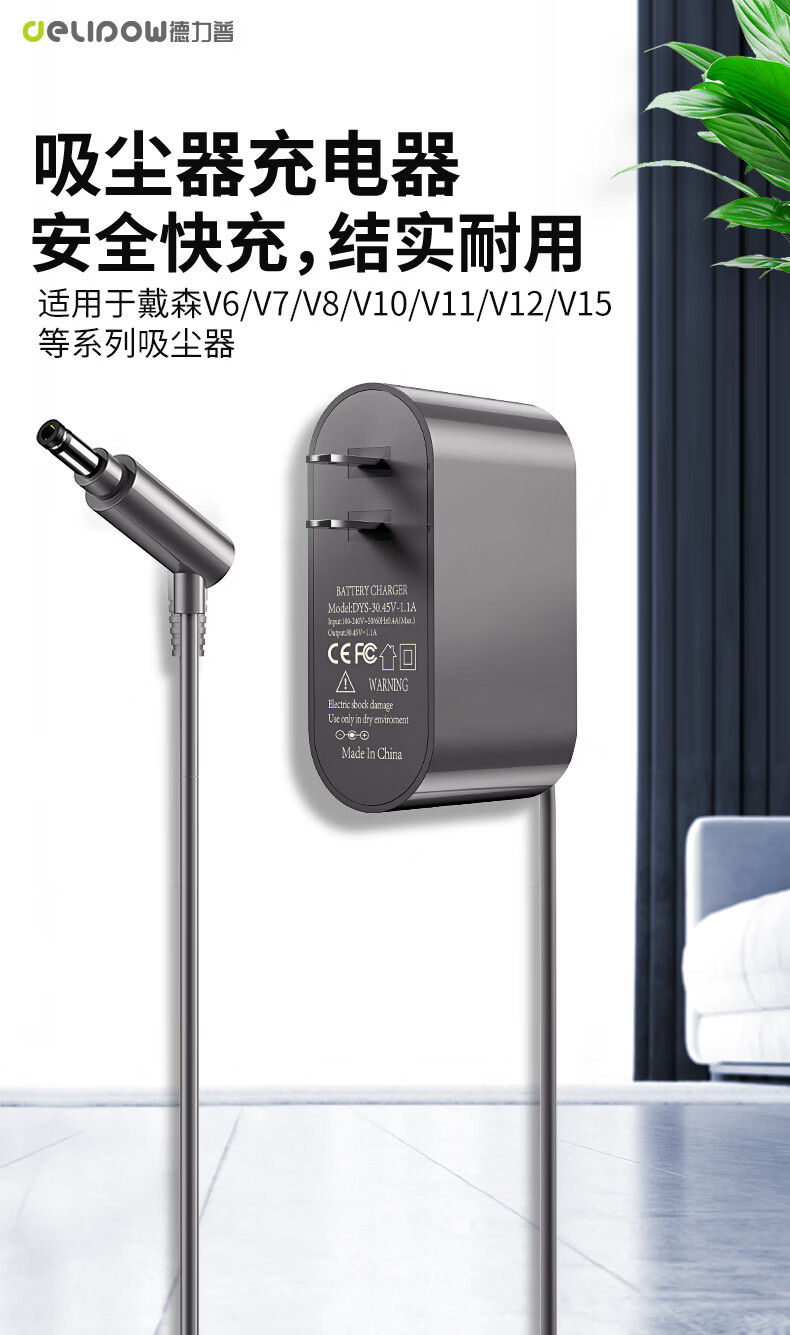德力普(Delipow)适配dyson戴森吸尘器锂电池充电器V6/V7/V8/V10/V11/V12/V15 DC62/58/74电源线适配器充电头配件