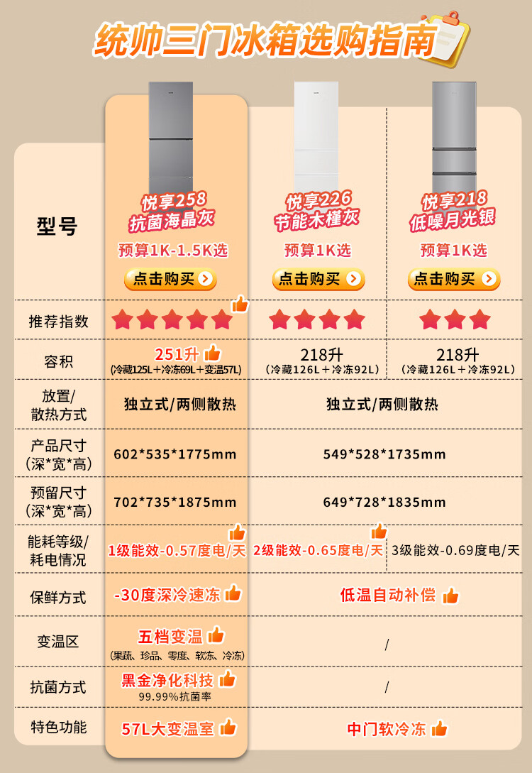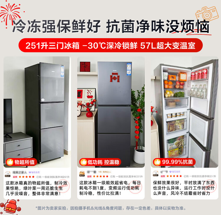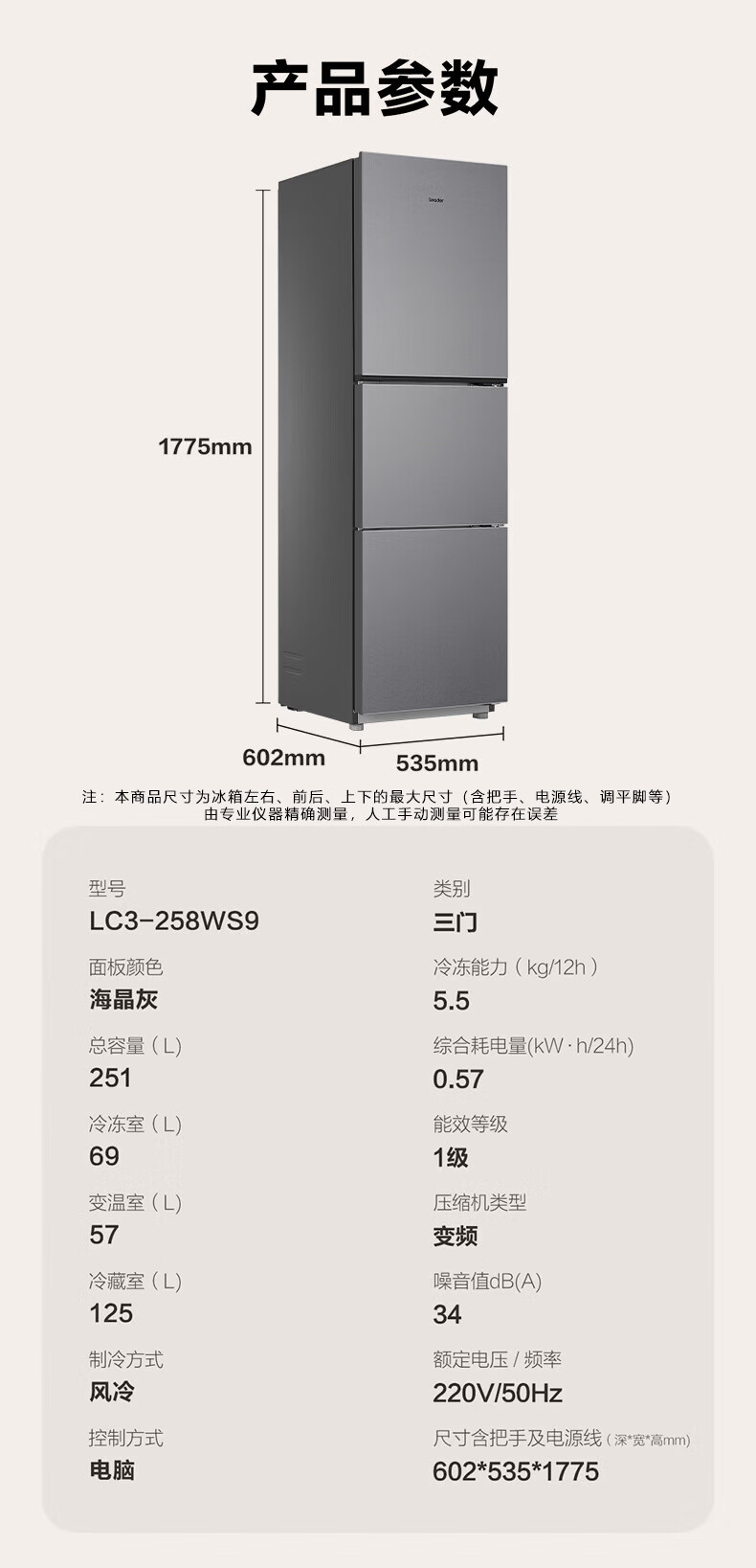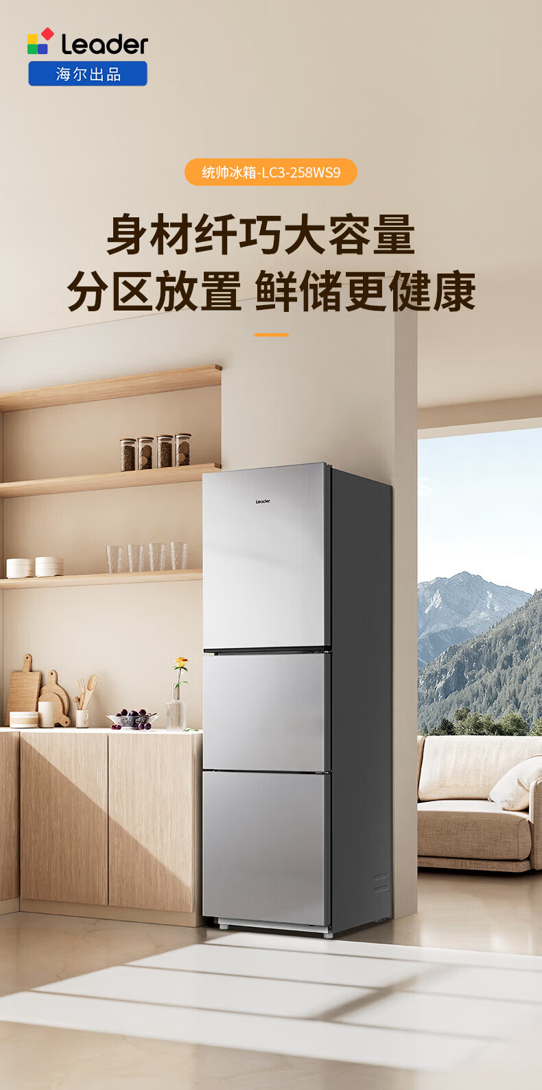 海尔(Haier)冰箱出品统帅悦享系列251L三门小冰箱家用净味一级能效风冷无霜LC3-258WS9