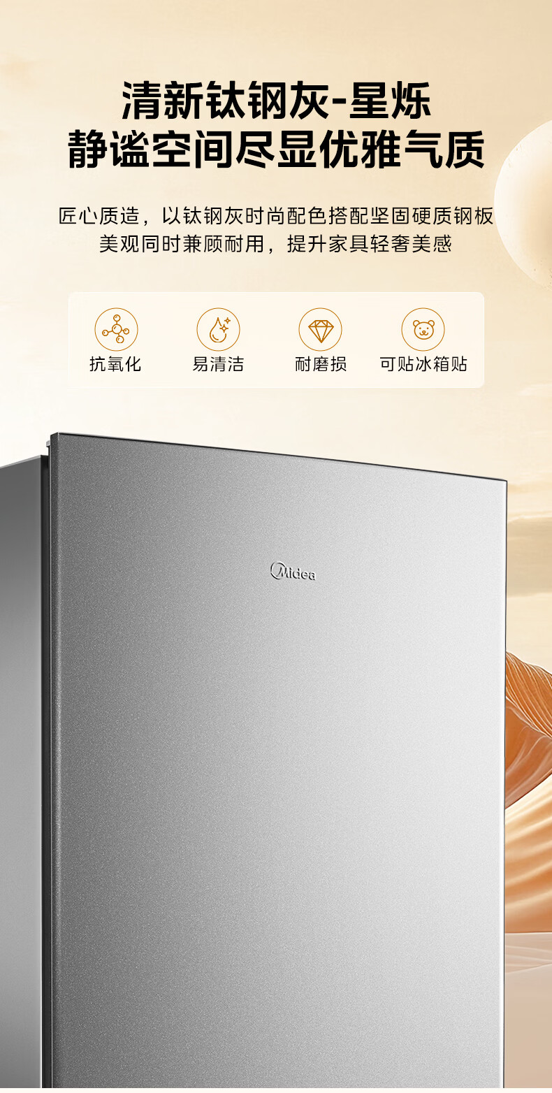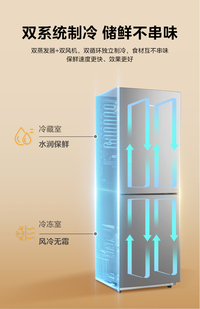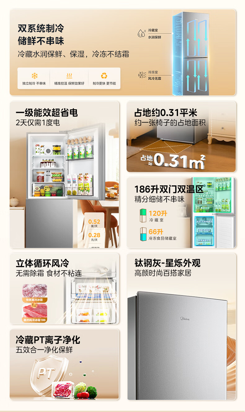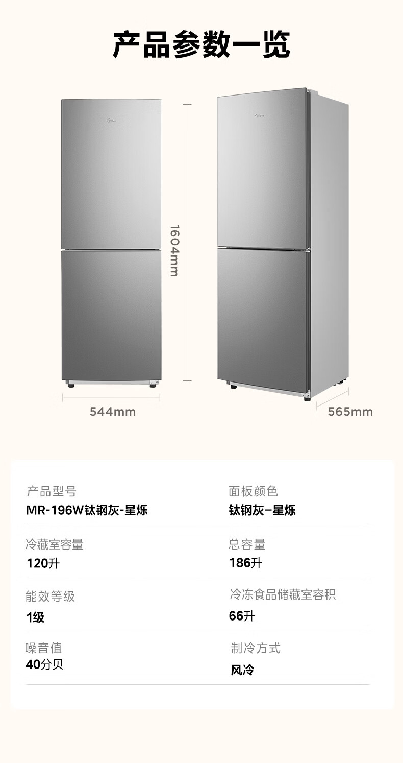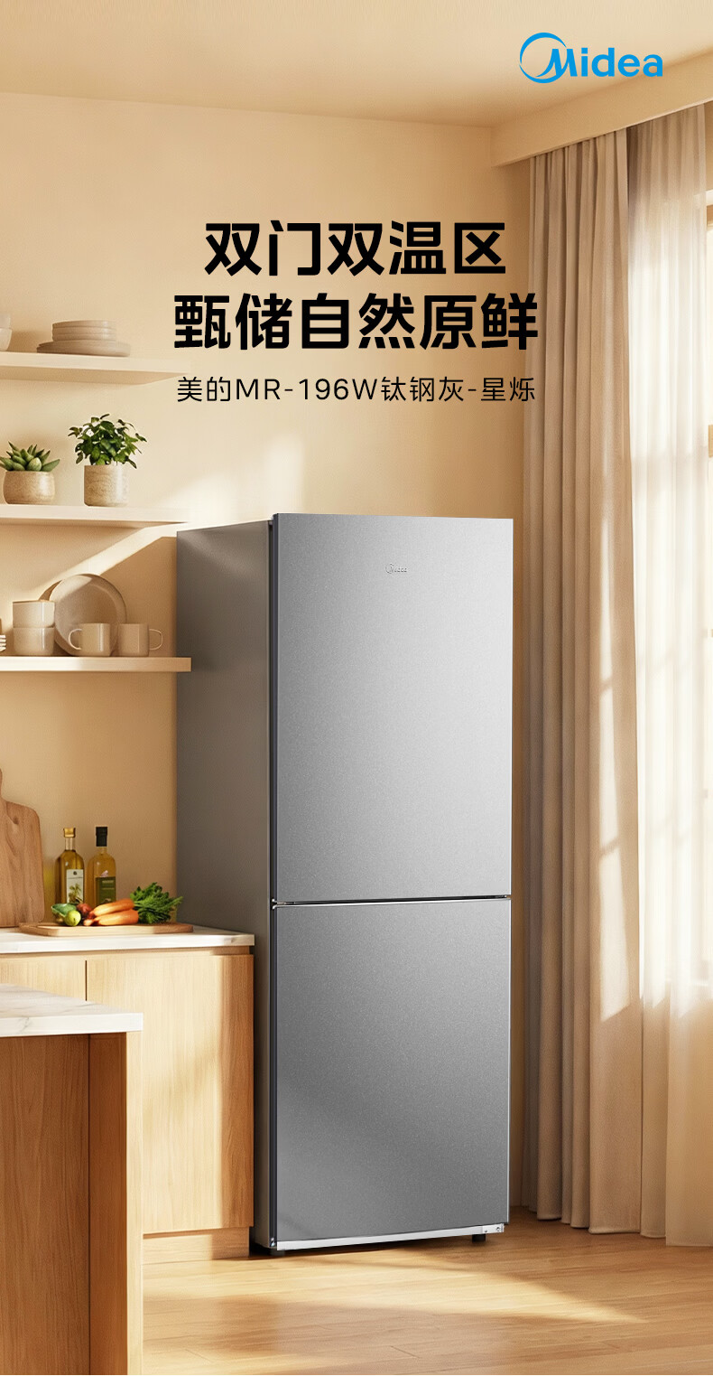 美的(Midea)「一级能效风冷无霜」186升两门冰箱小户型家用省电双门双系统不串味 钛钢灰MR-196W