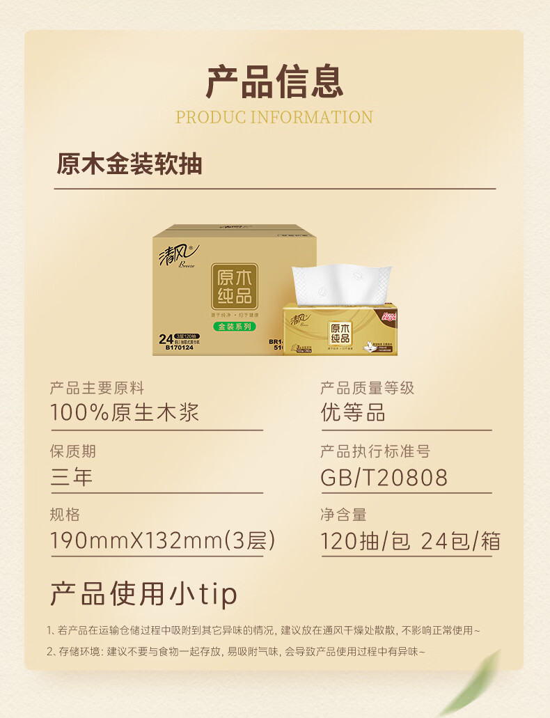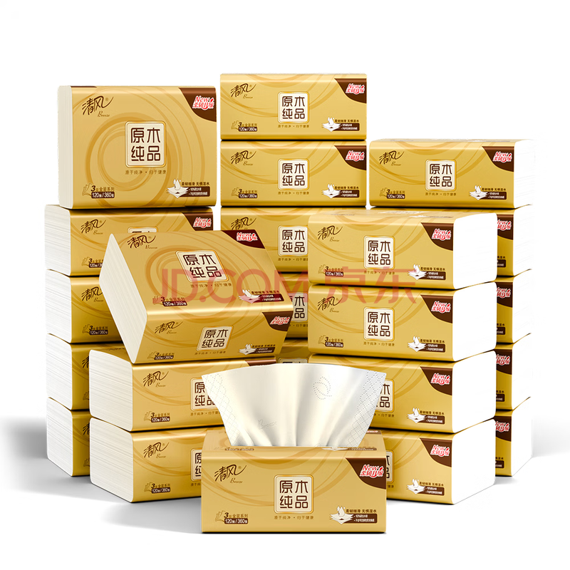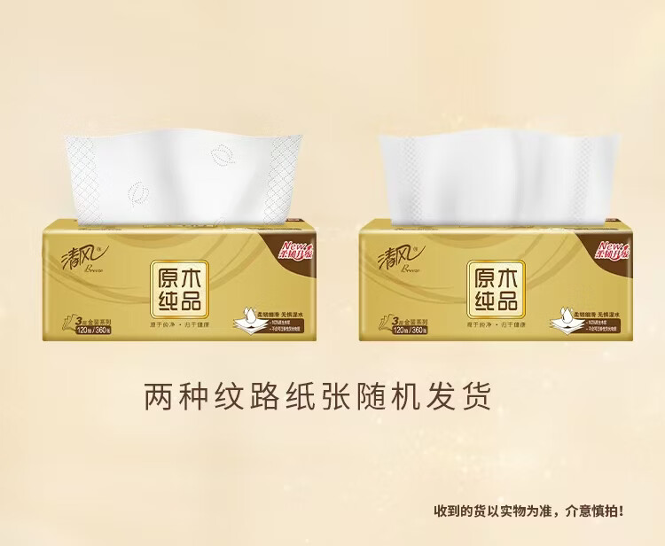 清风抽纸 金装厚韧3层120抽*24包 可湿水 纸抽 卫生纸面巾纸 整箱纸巾