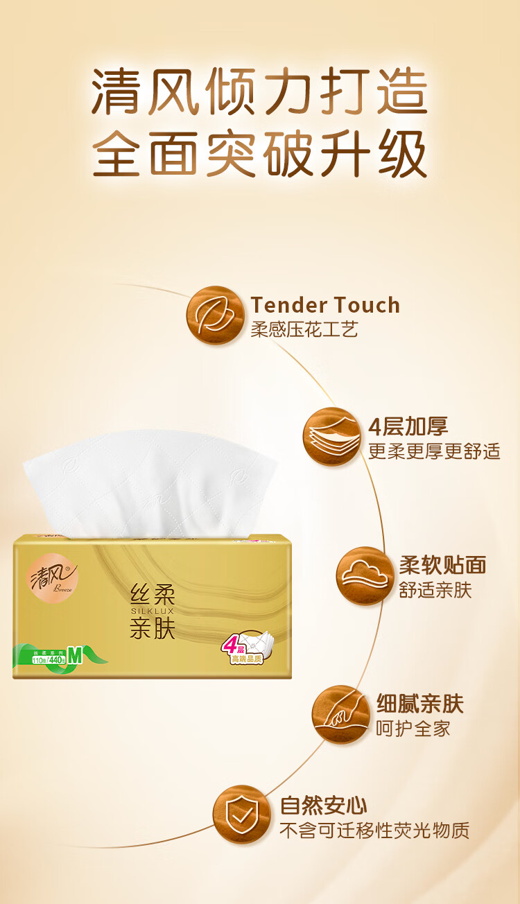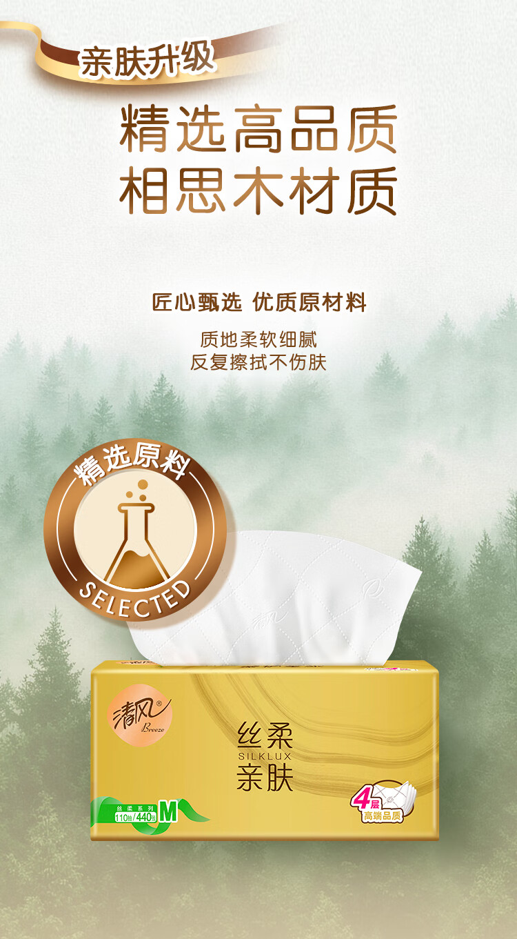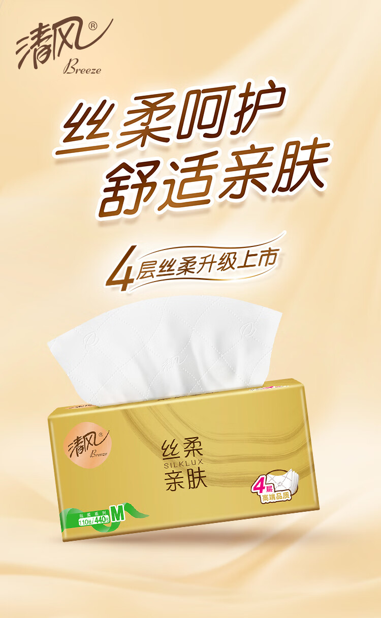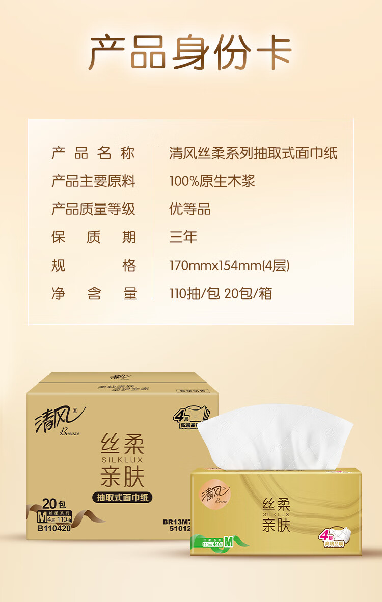 清风抽纸 丝柔4层110抽*20包M码 卫生纸巾抽纸家用 面巾纸 整箱装