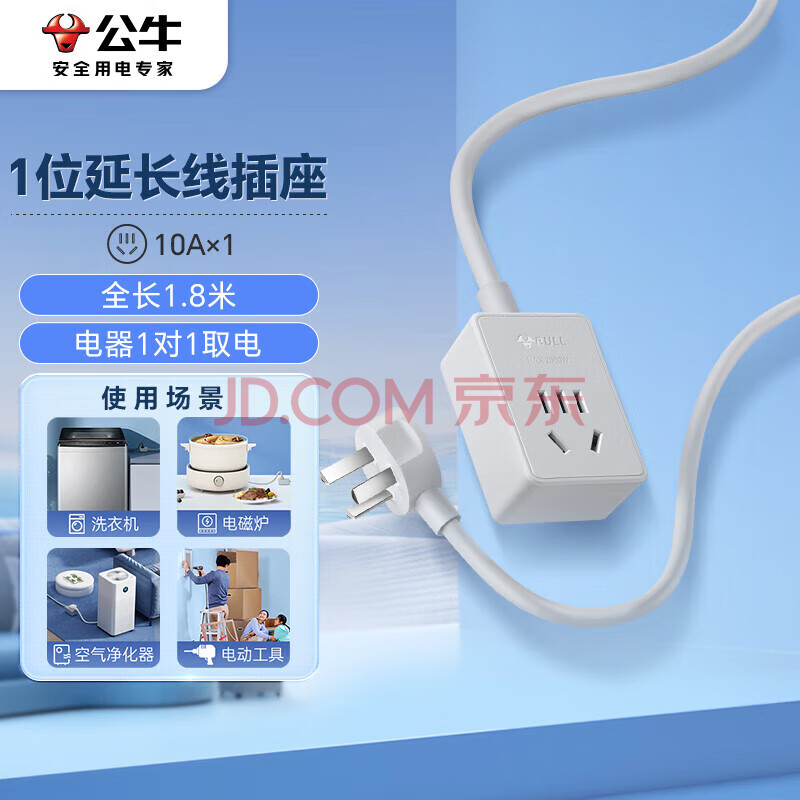 公牛(BULL)公牛插座/插线板/插排/排插/接线板/拖线板/延长线 1位无开关全长1.8米 GN-100101