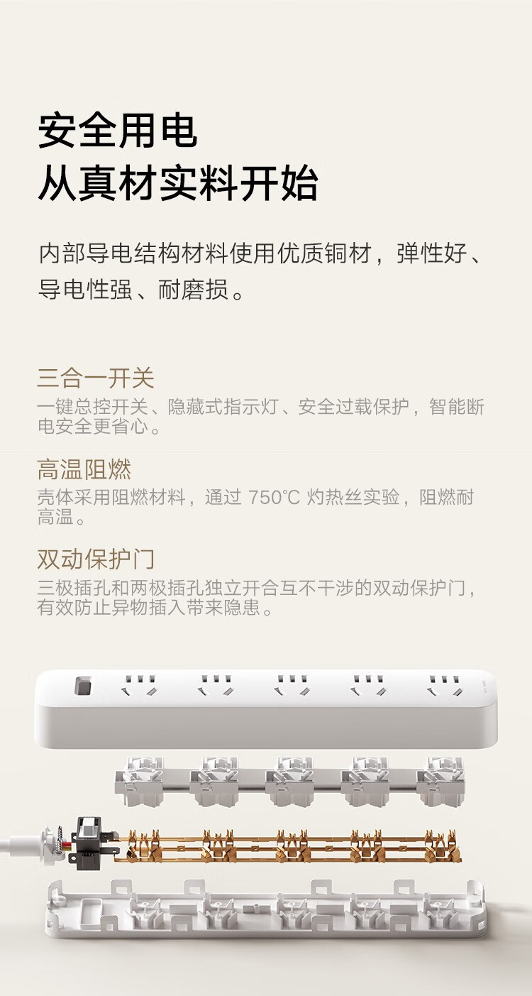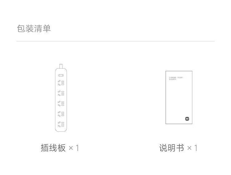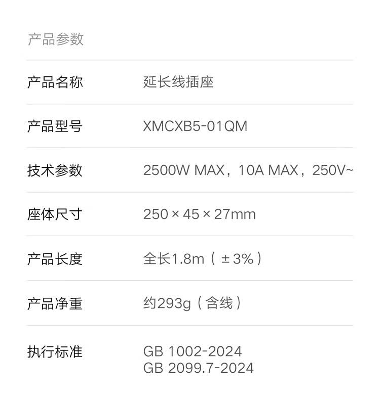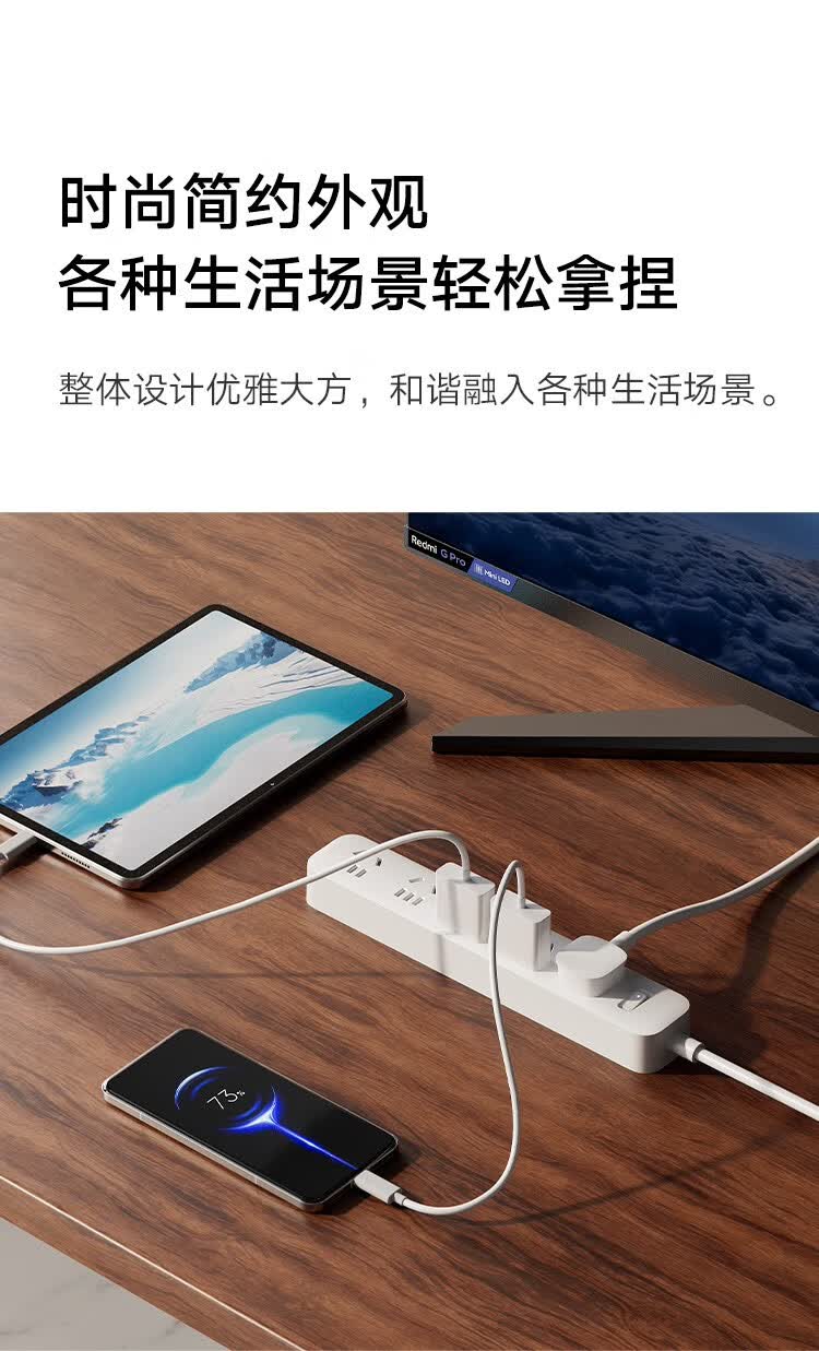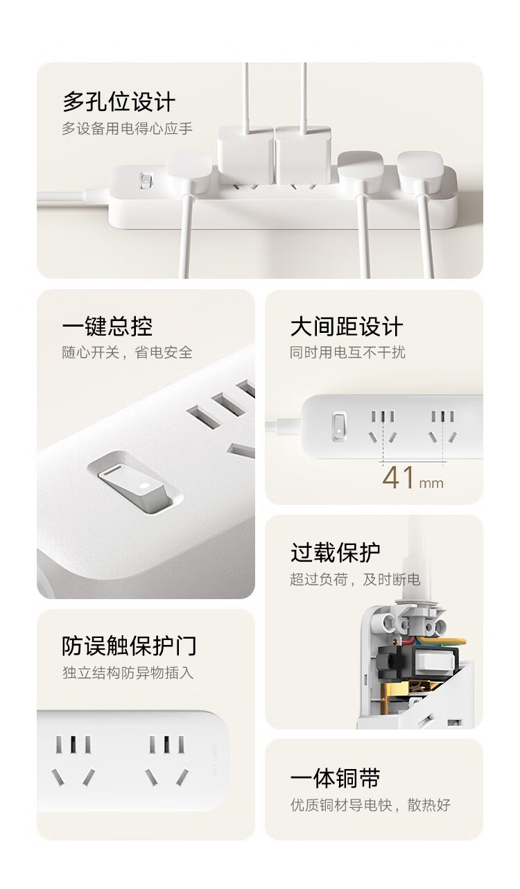 小米(MI)新国标插座/插线板/插排/排插/接线板/拖线板5位总控开关全长约1.8米小米电暖器/热水器/电热毯