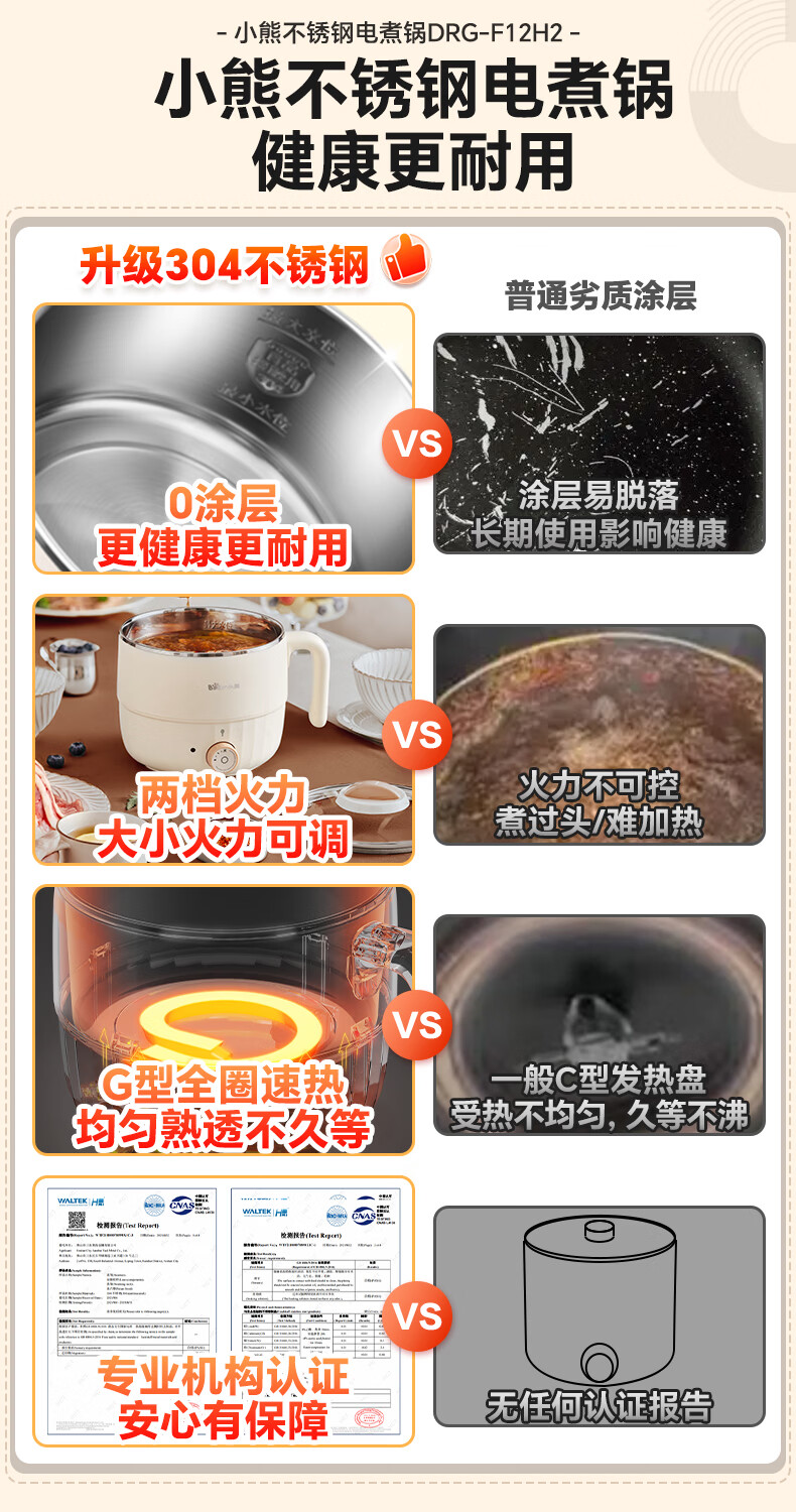 小熊(Bear)不锈钢电煮锅 宿舍小锅 小电锅 学生寝室一体泡面火锅 多功能电热锅 电煮锅小型1-2人F12H2配蒸笼