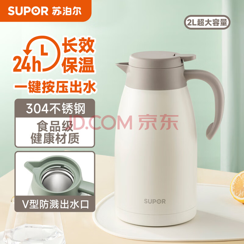 苏泊尔(SUPOR)家用真空保温瓶暖水壶瓶大容量热开水瓶壶304不锈钢2.0L燕麦白