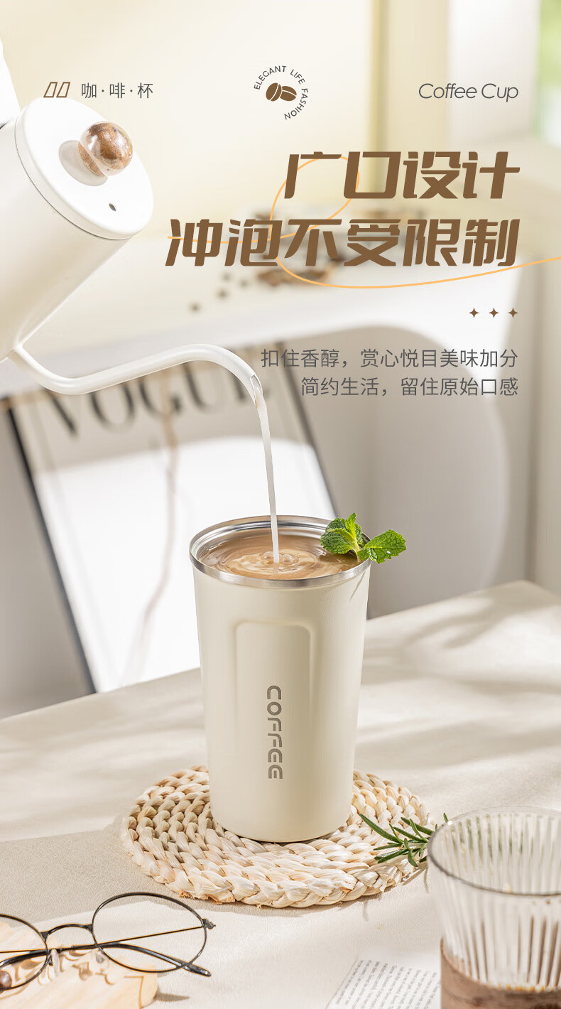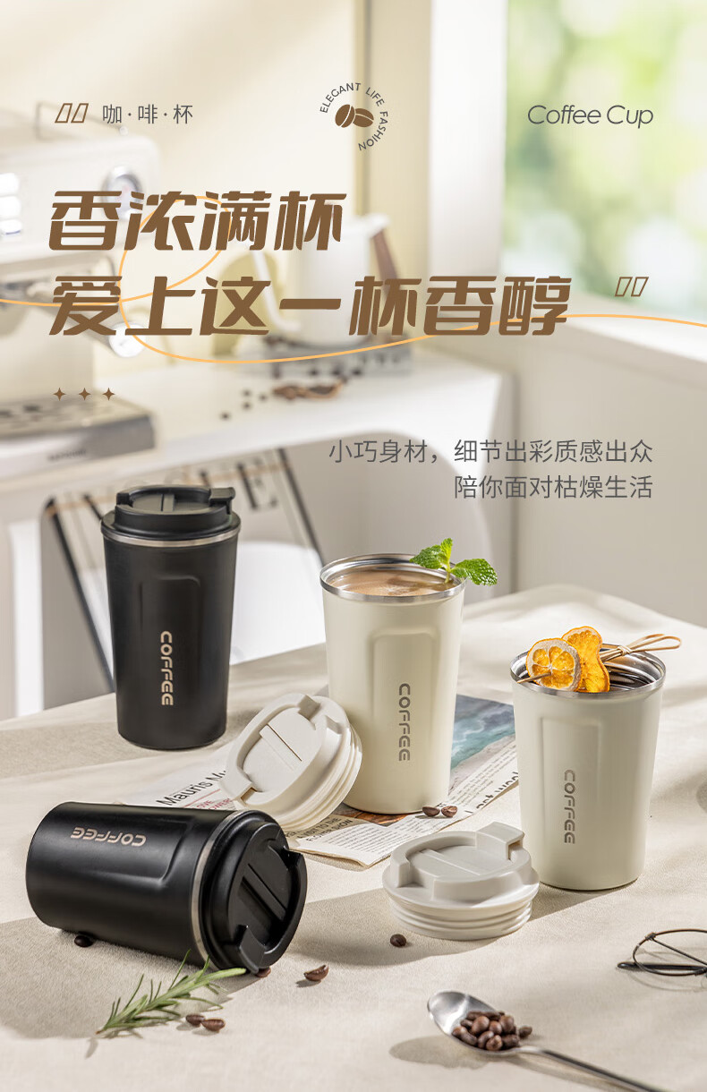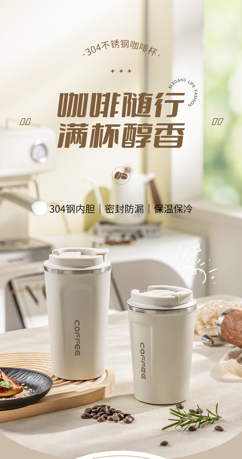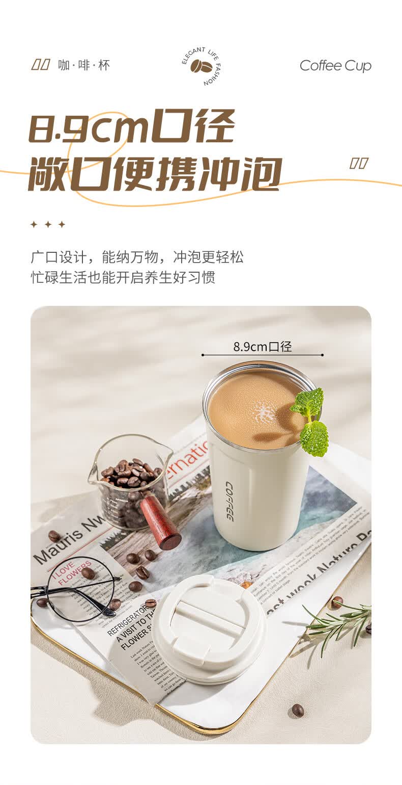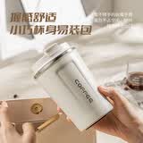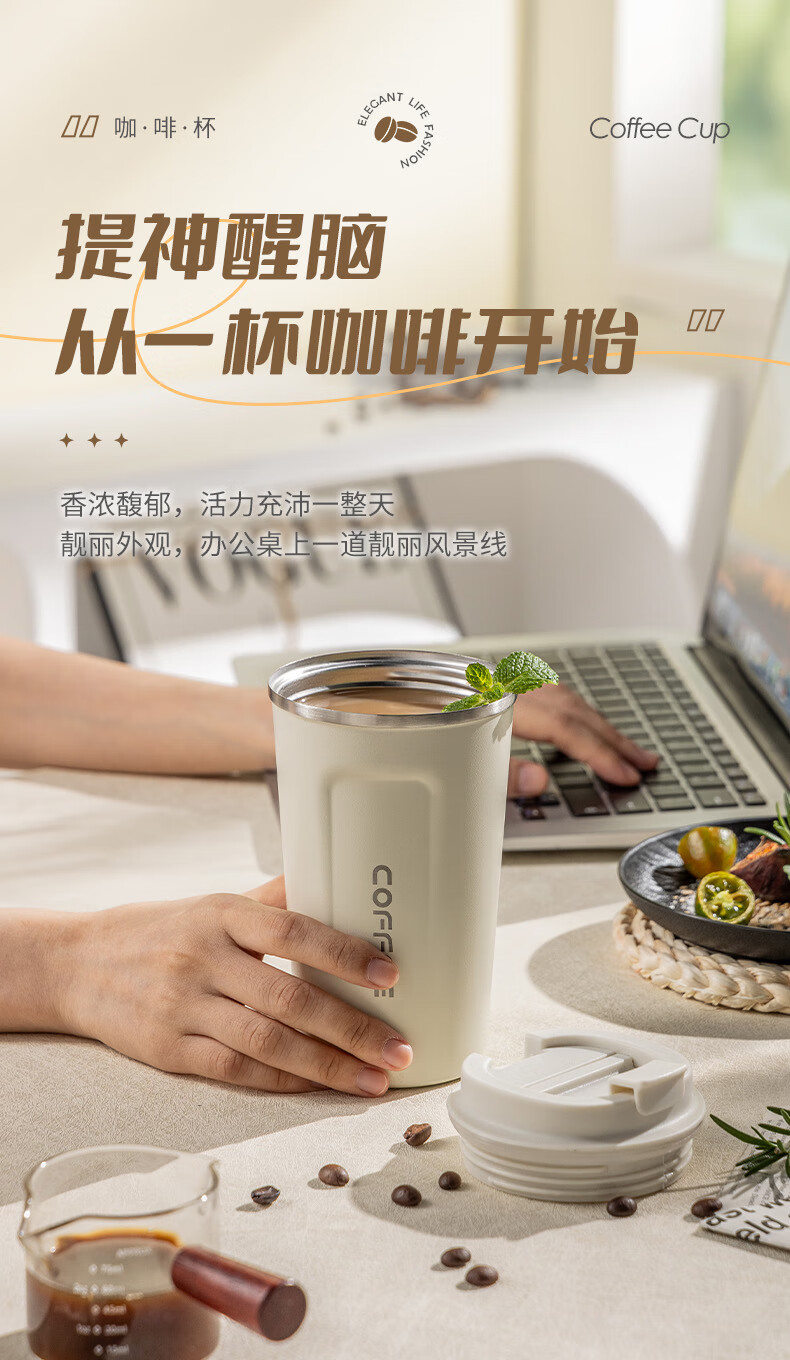 广意咖啡杯高颜值不锈钢保温带盖随行杯男士车载便携水杯大号白GY7976