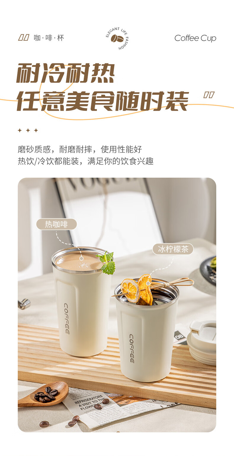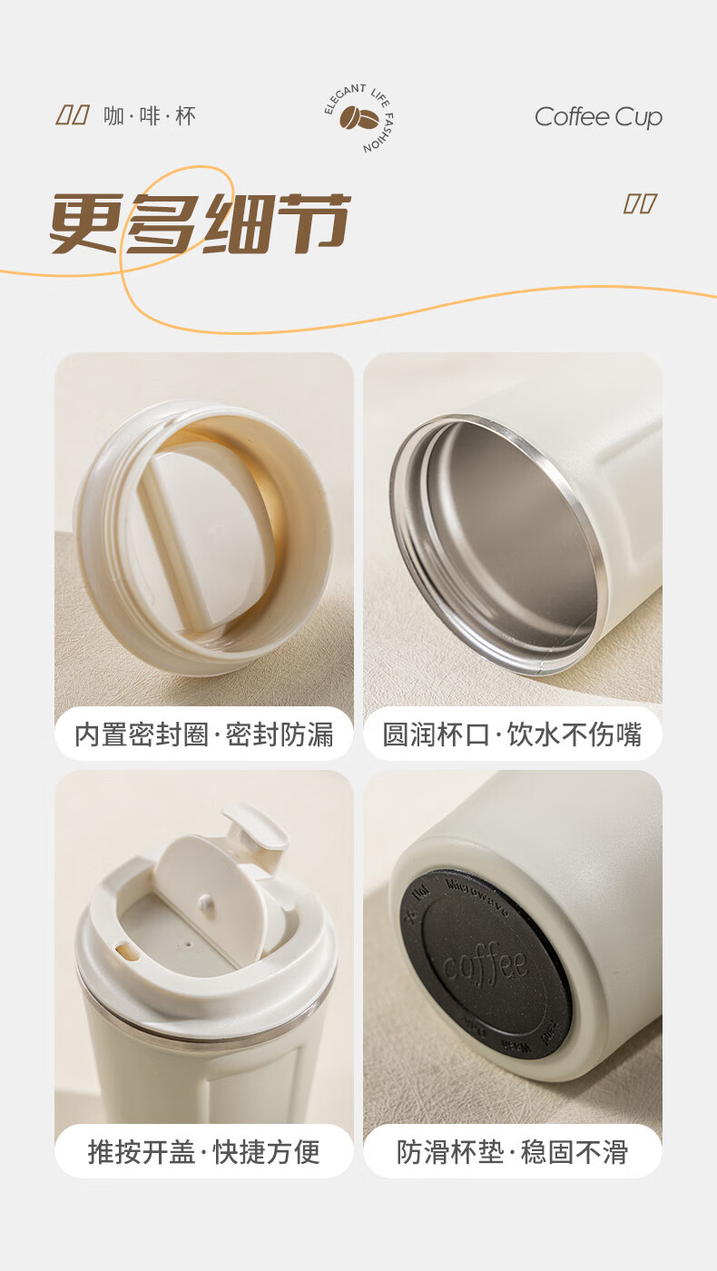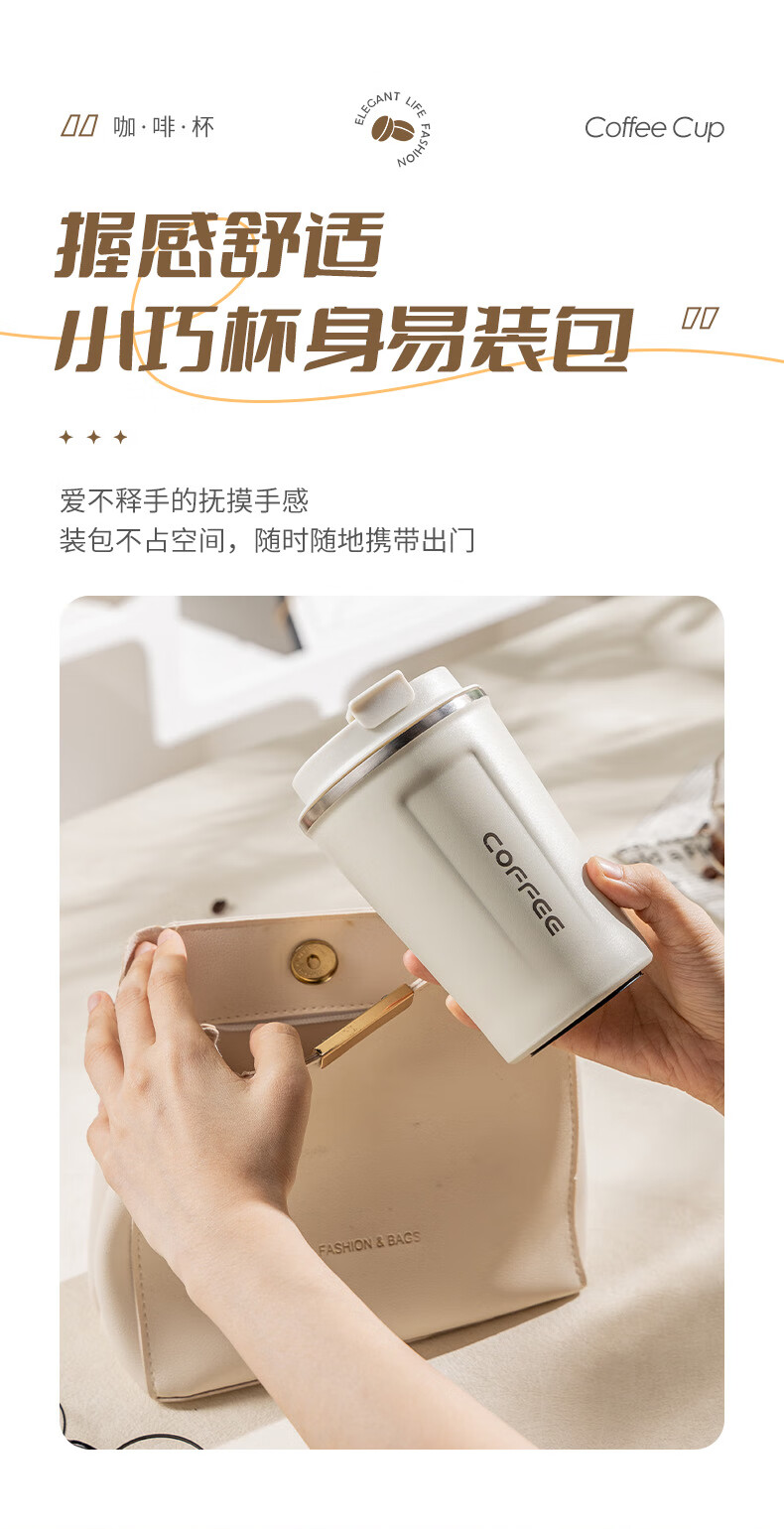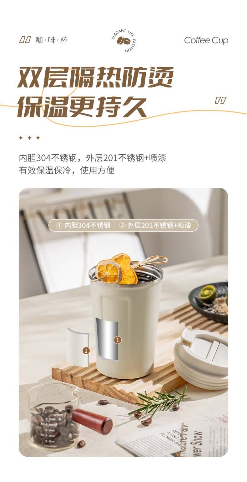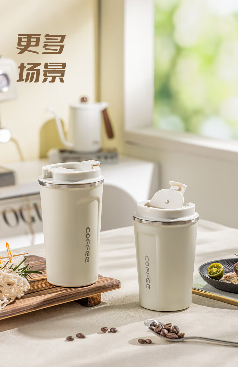 广意咖啡杯高颜值不锈钢保温带盖随行杯男士车载便携水杯大号白GY7976