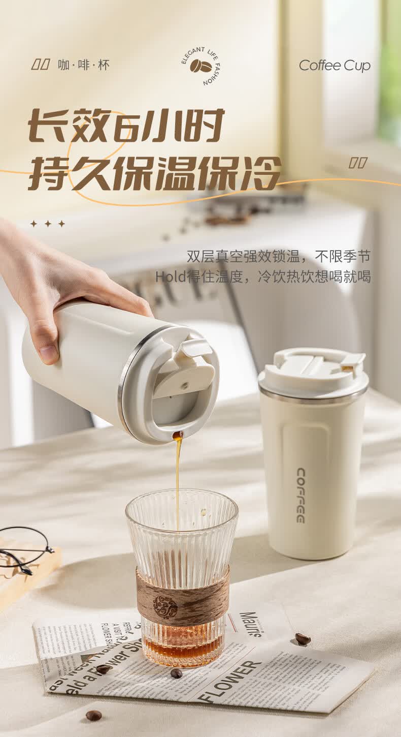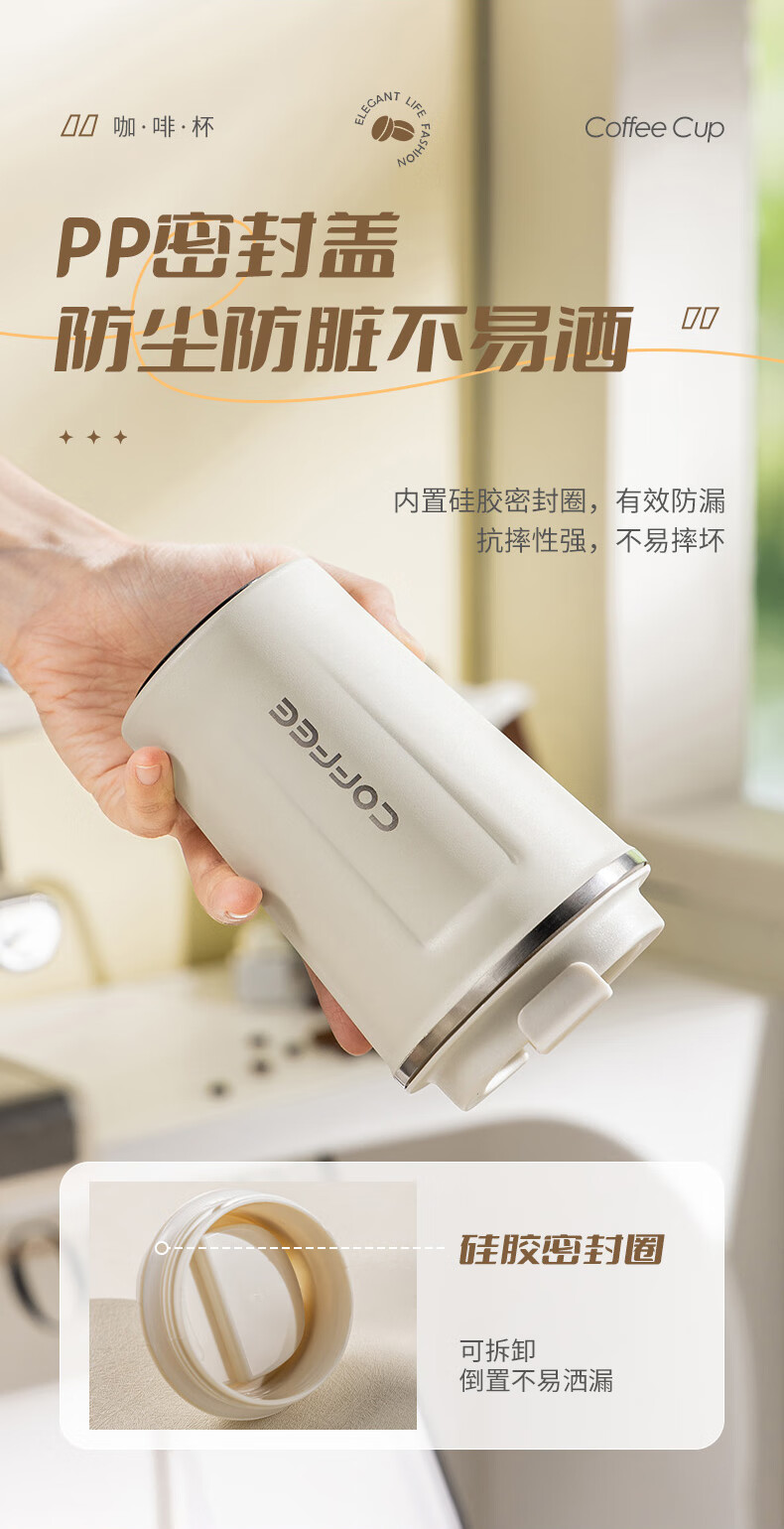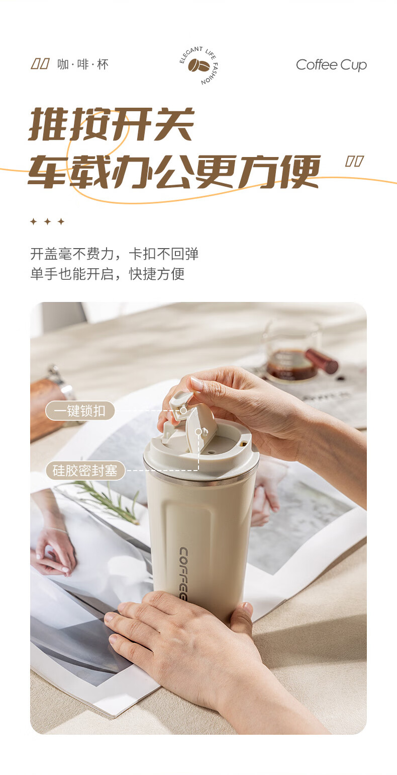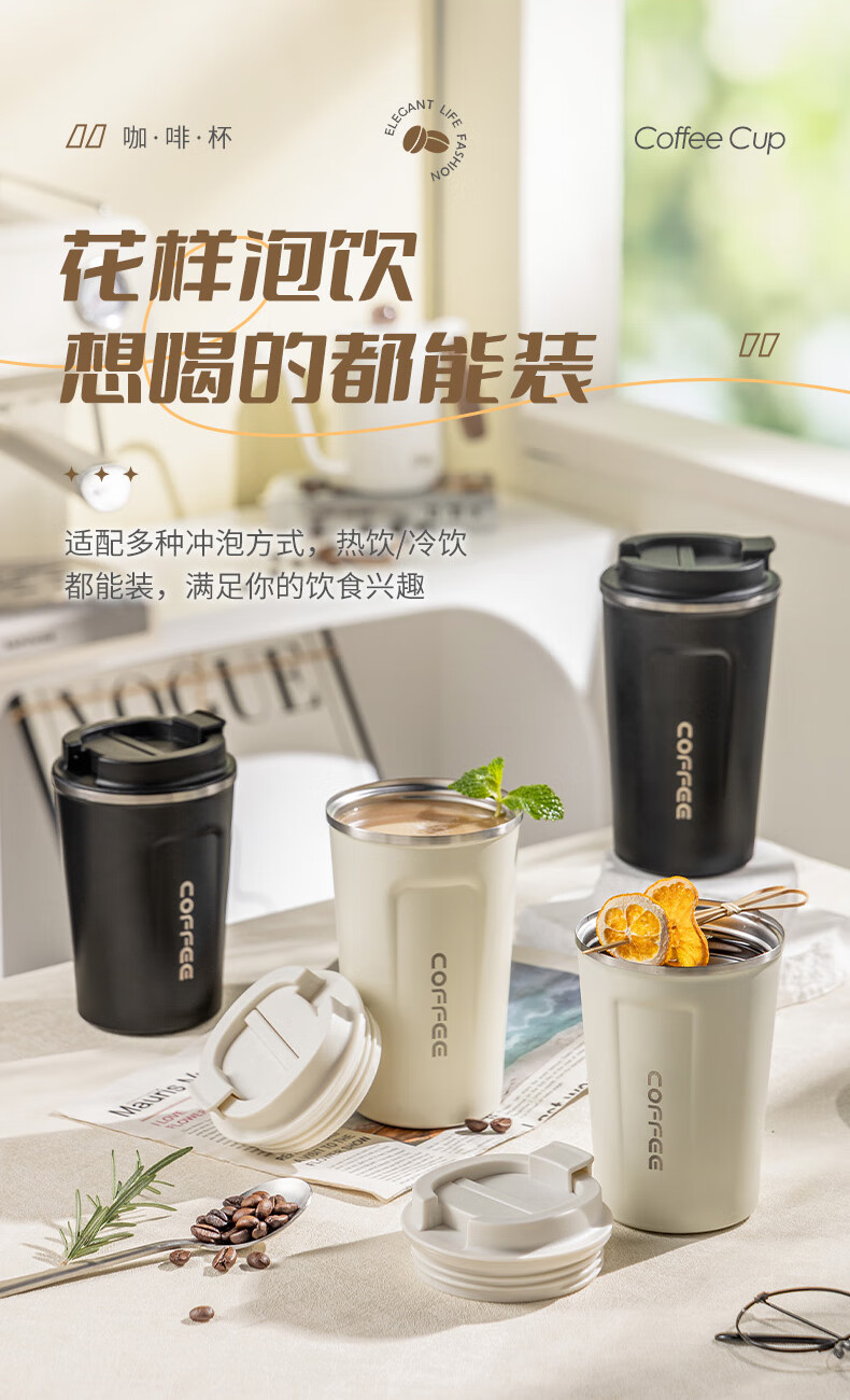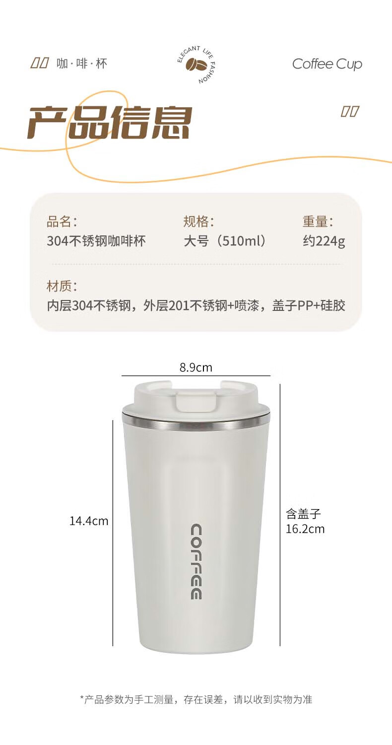 广意咖啡杯高颜值不锈钢保温带盖随行杯男士车载便携水杯大号白GY7976