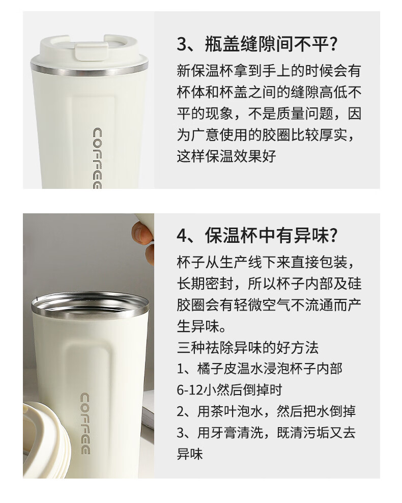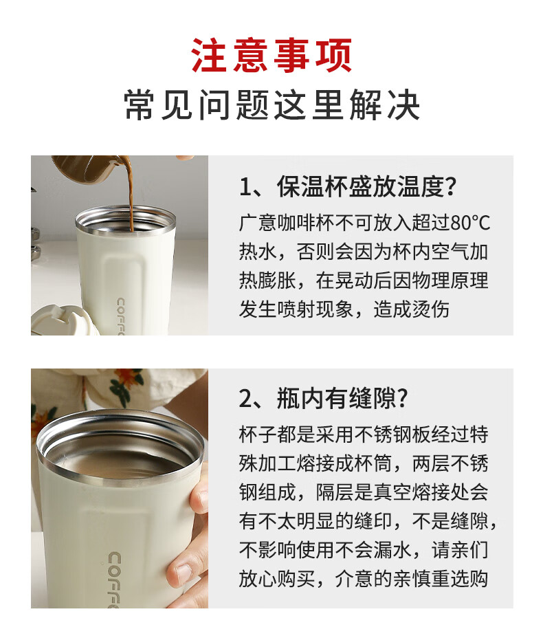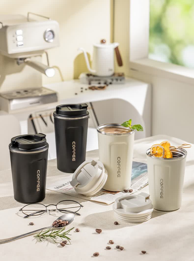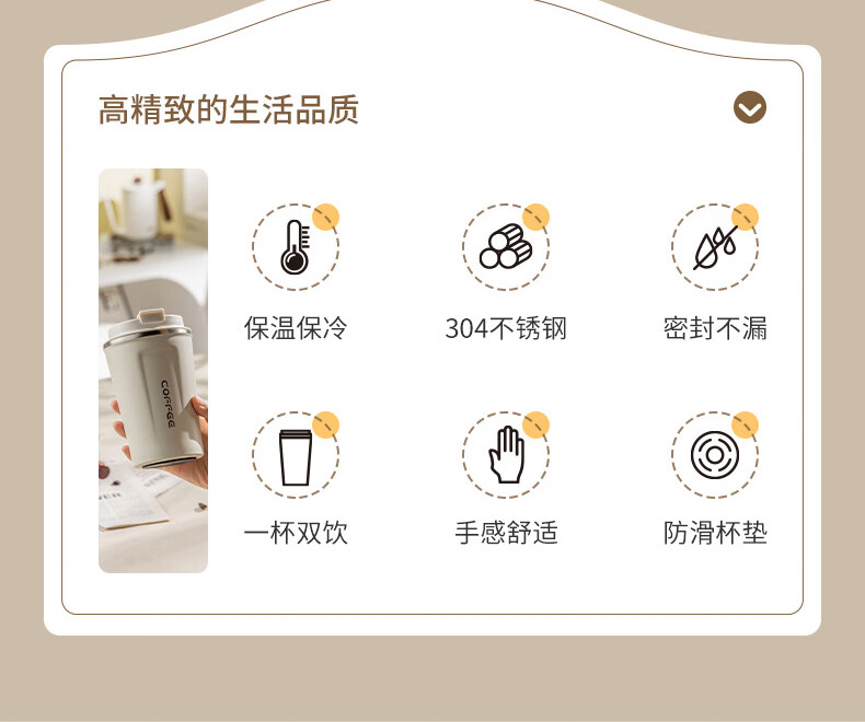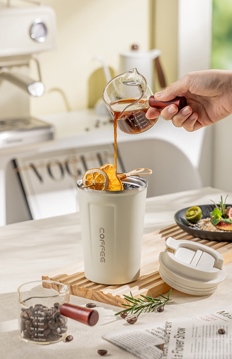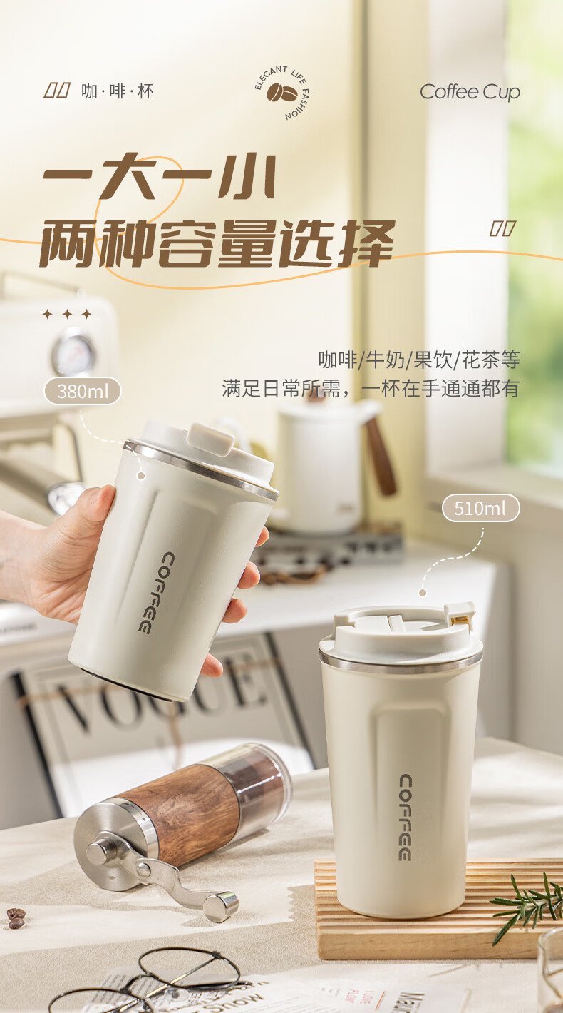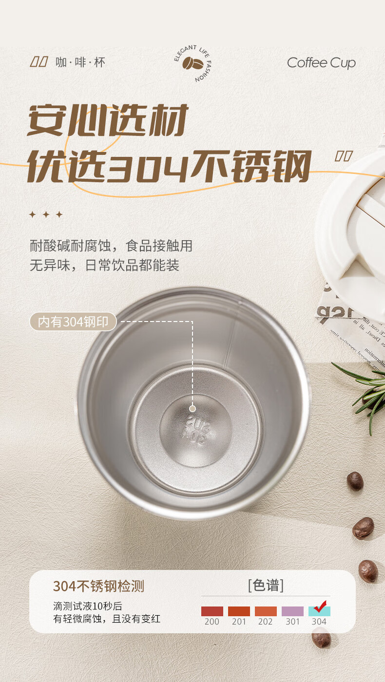 广意咖啡杯高颜值不锈钢保温带盖随行杯男士车载便携水杯大号白GY7976