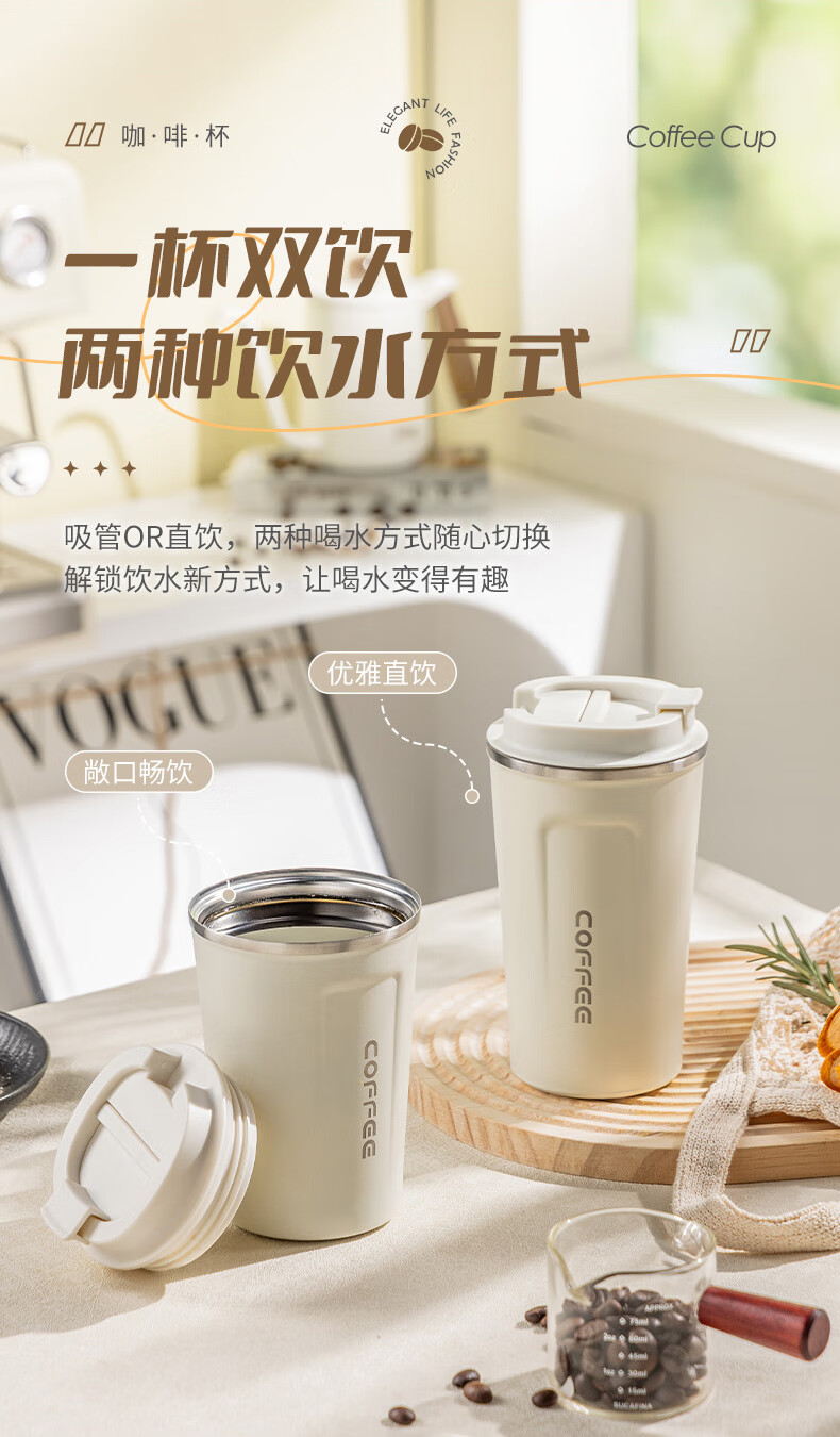 Vanow纯钛咖啡杯女生高颜值双饮吸管保温杯高档便携车载