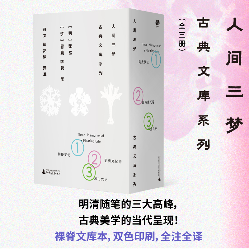 《陶庵梦忆》作者:张岱(1597—1684),明代作家,山阴(今浙江绍兴)人。他一生著述颇丰,其中不少已佚失,今可见者有《琅嬛文集》《陶庵梦忆》《西湖梦寻》《石匮书》《夜航船》等。译者:彭剑斌作家,1982年生,湖南桂阳人。已出版作品《我去钱德勒威尔参加舞会》《不检点与倍缠绵书》《寂静连绵的山脉》《欣泣集》。《影梅庵忆语》作者:冒襄(1611—1693),字辟疆,号巢民,明末清初的文学家,江苏如皋人。译者:羽戈,学者、作家。2004年毕业于西南政法大学法学院,致力于政治学与中国近代史研究。代表作《不为什么而读书》《激进之踵:戊戌变法反思录》《知识与国运:近世政治人的困惑》等。《浮生六记》作者:沈复(1763—约1825),字三白,清代文人,江苏苏州人。出身幕僚家庭,一生未仕,靠做幕客、游历为生,生活清贫却心性旷达。他以自传体散文名作《浮生六记》闻名。书中记述他与妻子陈芸的日常生活、山水游历与人生感慨,文字清淡自然,不事雕饰,却情深意真,尤以对妻子的深情书写动人。译者:羽戈,学者、作家。2004 年毕业于西南政法大学法学院,致力于政治学与中国近代史研究。代表作《不为什么而读书》《激进之踵:戊戌变法反思录》《知识与国运:近世政治人的困惑》等。