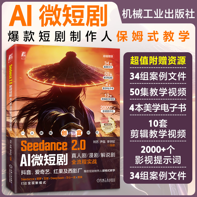 本书是一本专注于微短剧创作的实战全能指南。全书采用清晰的版式和通俗的语言,系统讲解了微短剧从创意策划、AI生成,到使用剪映剪辑的完整流程。内容深度整合了前沿的Seedance 2.0大模型工具应用及高效的剪映操作技巧,通过详尽的步骤解析和丰富的案例演示,手把手教读者制作兼具网感与品质的爆款AI微短剧。随书附赠10套影视相关教学视频、4套美学电子手册等海量学习资源,以及特别赠送的《微短剧行业规范标准手册》(扫封底二维码,进入本书专属云盘获取),非常适合从零起步的AI微短剧新手、寻求突破的内容创作者,以及希望抓住AI微短剧新风口的所有人自学。